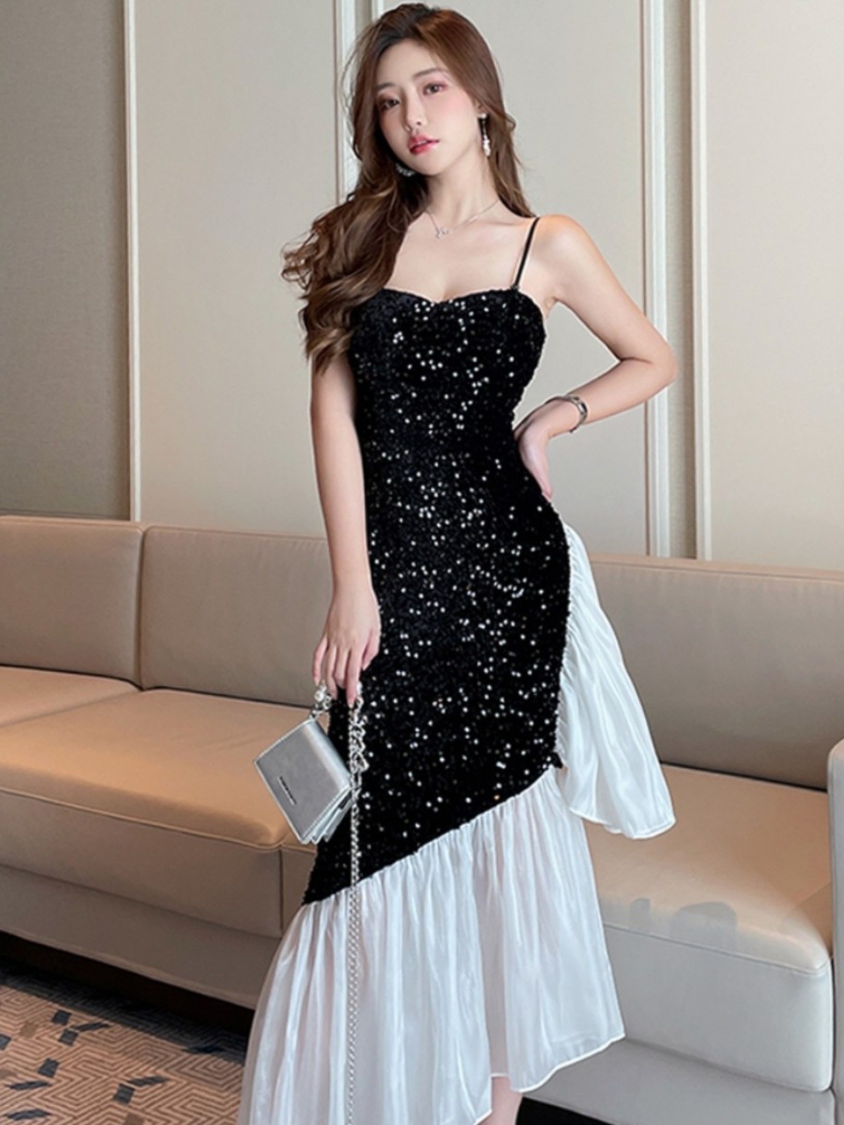 フレンチエレガントレディのスパンコールドレススリムフィットお尻カバーブサスペンダードレス秋 ドレス