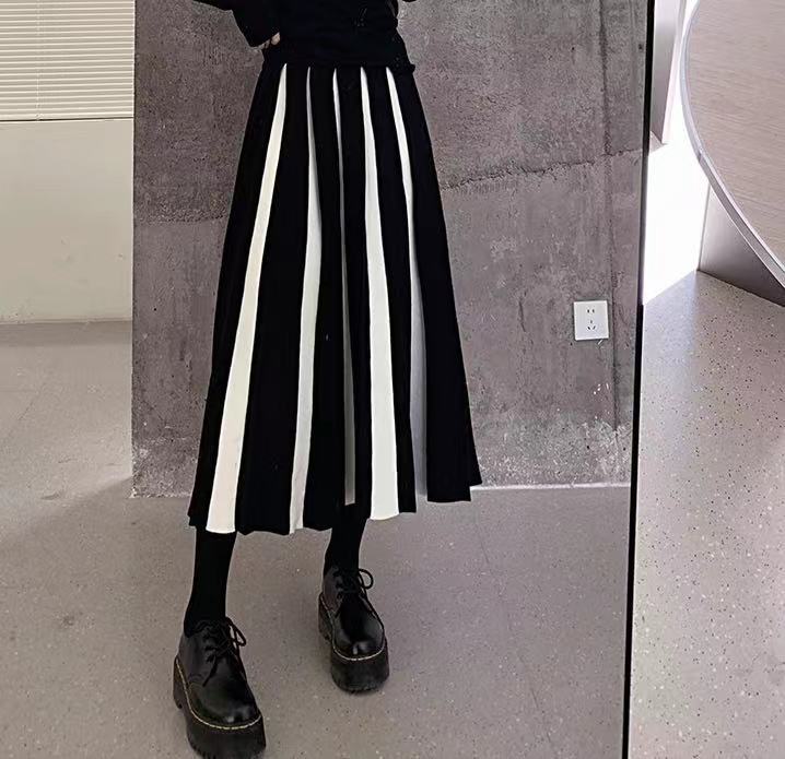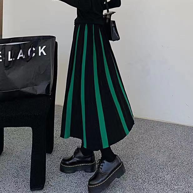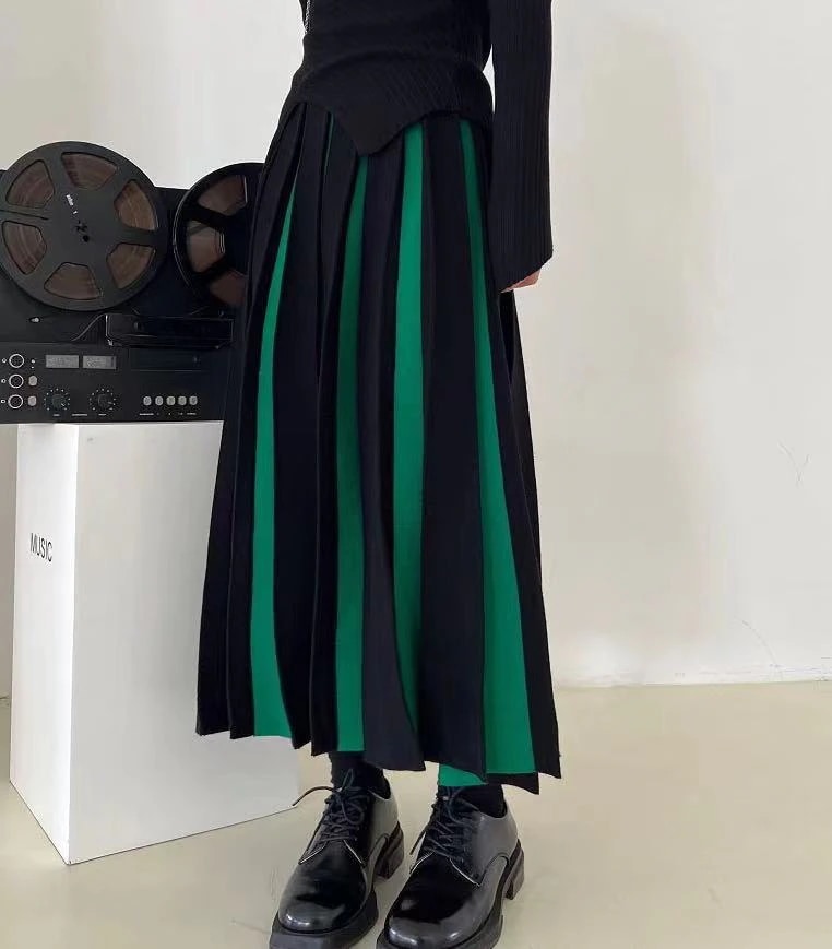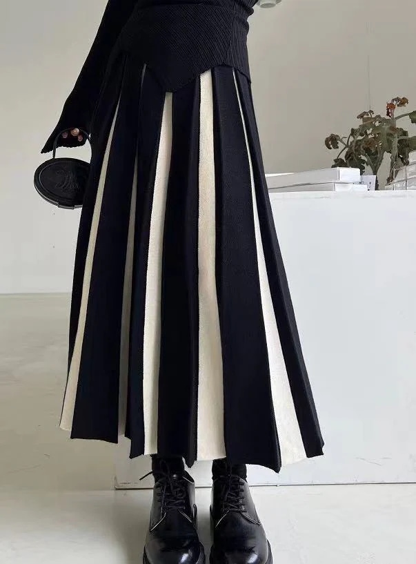 プリーツスカート マキシスカート 夕イトスカ一ト ins ニット レトロ ハイウエスト パッチワーク セミロング スカート ロングスカート