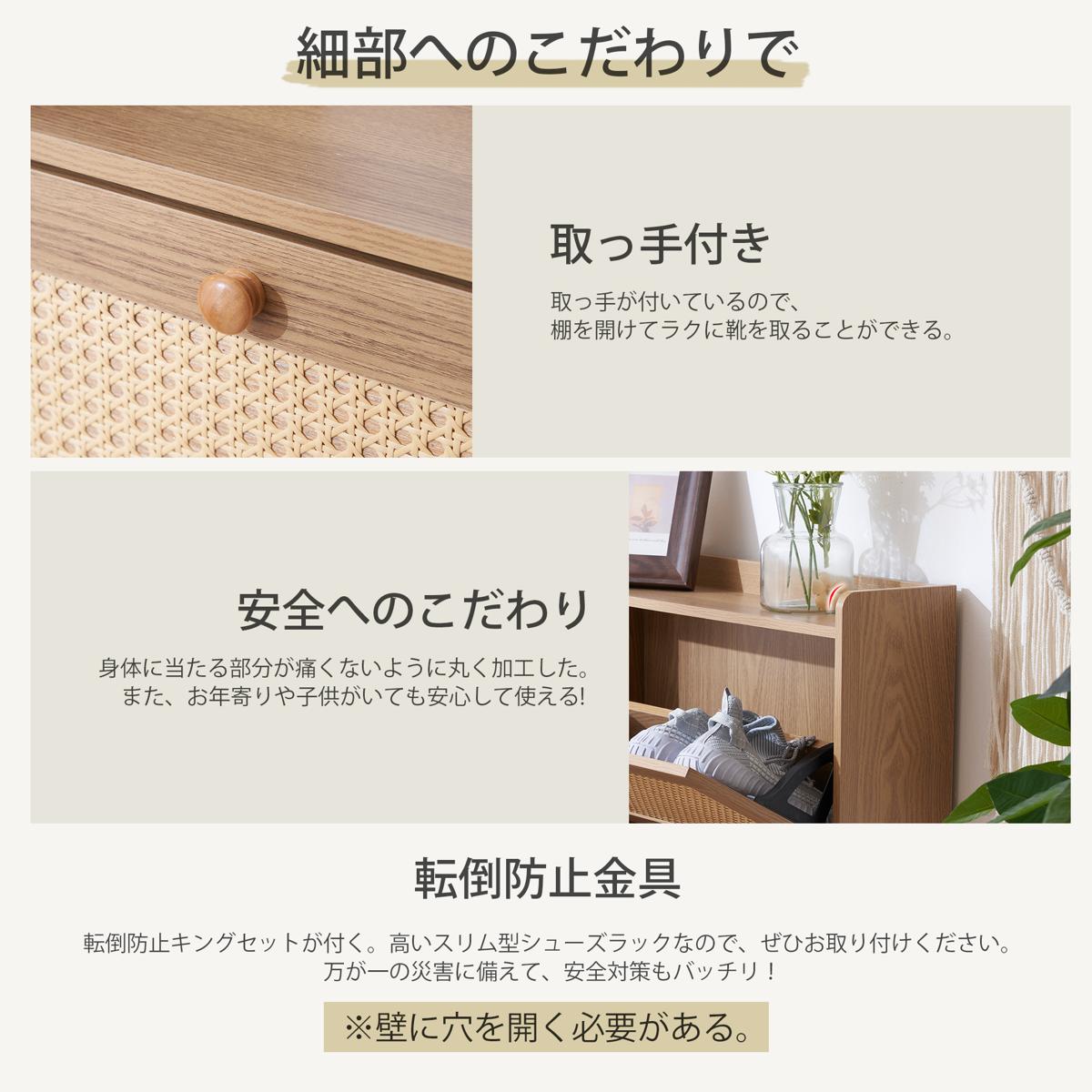 【細部へのこだわりで】転倒防止金具転倒防止キングセットが付く。高いスリム型シューズラックなので、 ぜひお取り付けください.