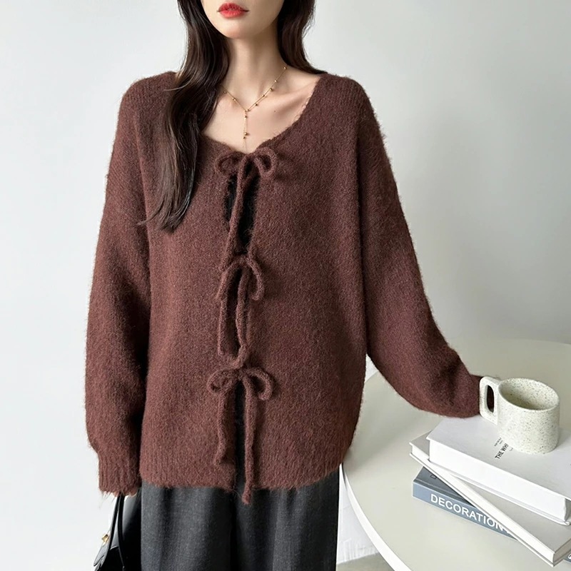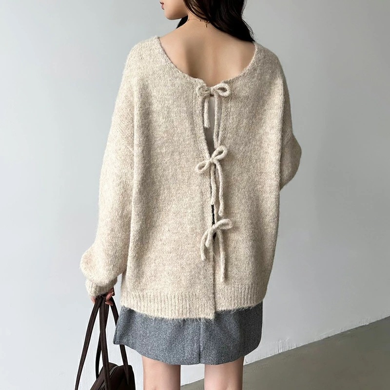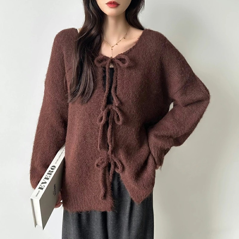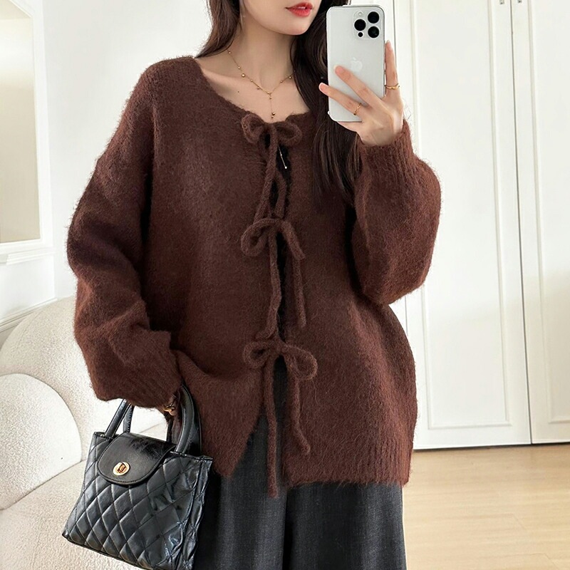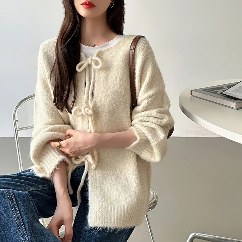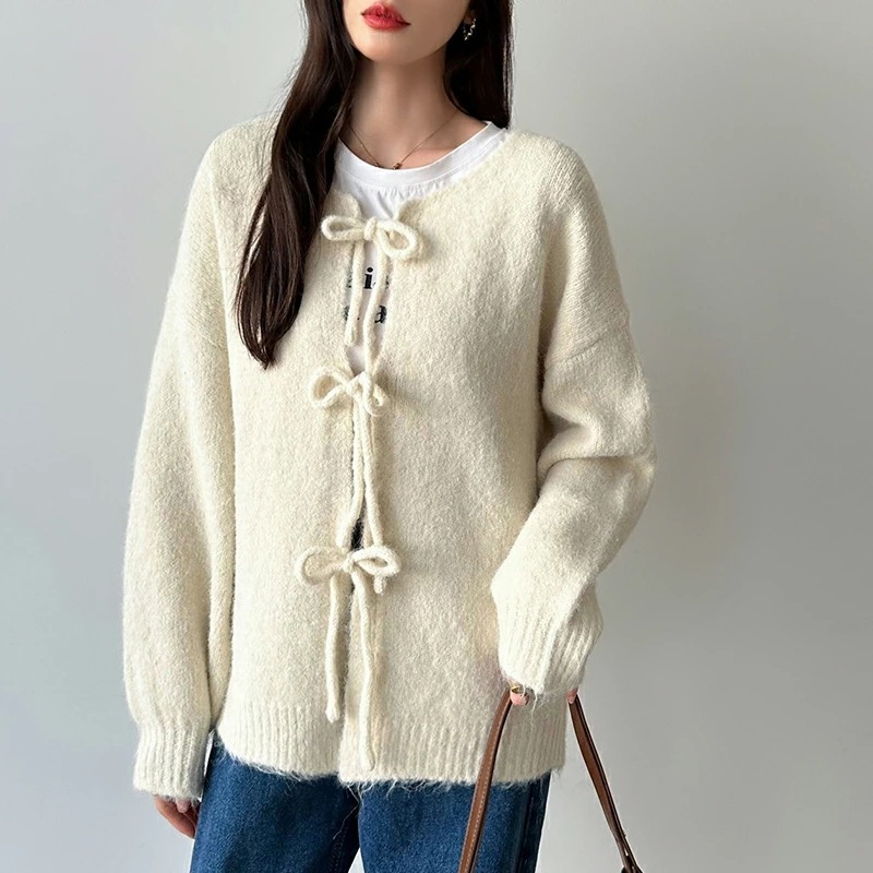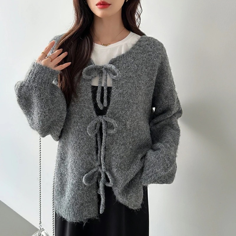 前後2way リボンカーディガン ニットカーディガン カーディガン リボン ニット レディース ドロップショルダー ラウンドネック トップス 長袖 ボレロ
