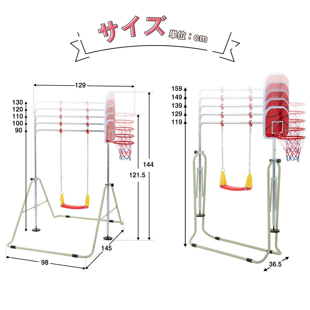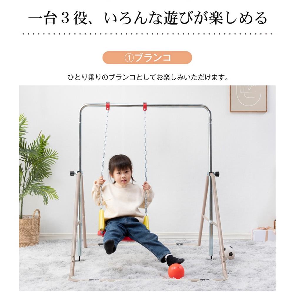 【やさしさポイント】01ブランコ装着時、安全にあそぶために、チェ一ンと支柱の間隔を広めに空けています。02お子様の成長などに合わせて、高さを5段階に調節できます。03床の傷つきを守る!ベ一スパイプにゴムのカバが四か所ついており、しっかりと鉄棒を固定し、床の傷、ズレの軽減になります。