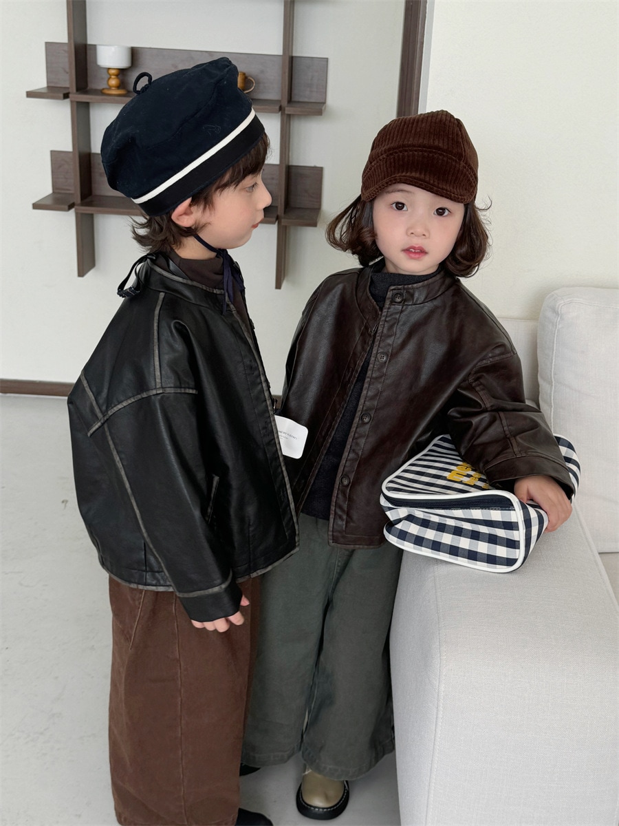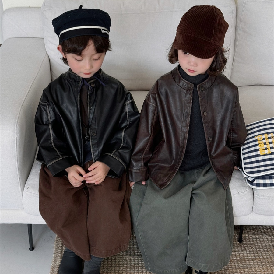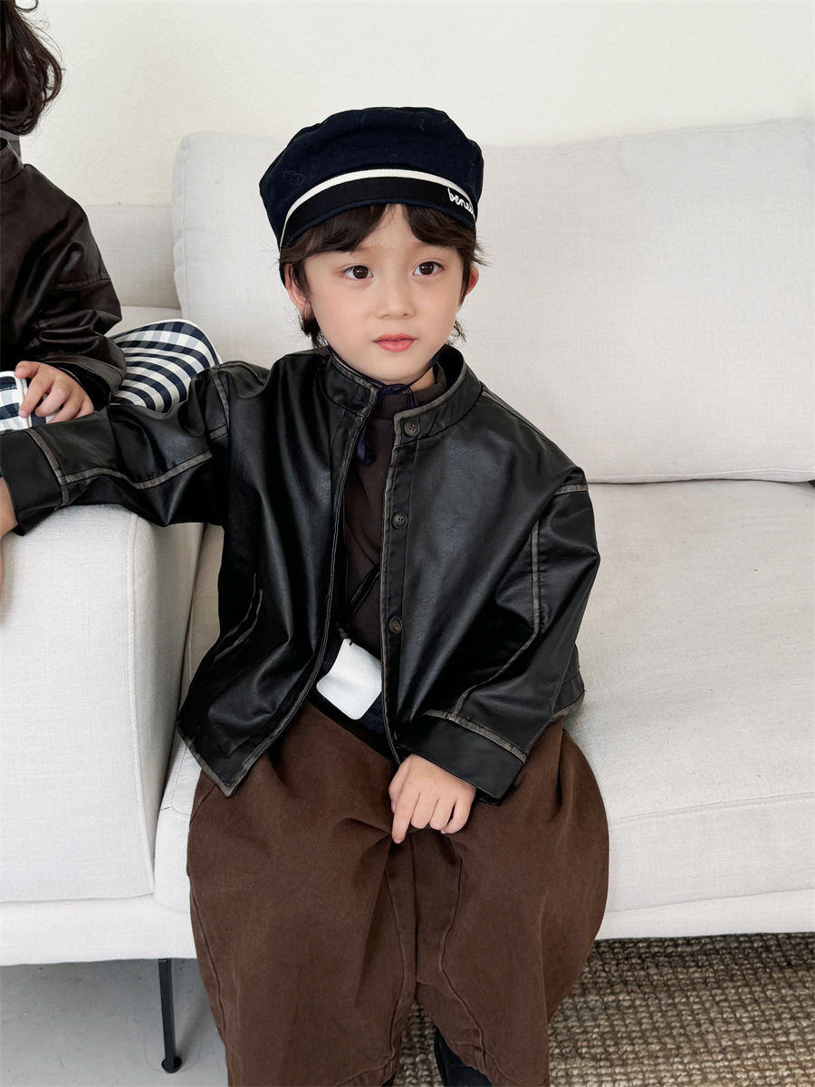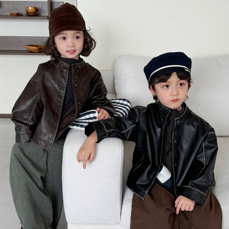 子拱服 アウター カーディガン子供服2025子供の秋の新しいこする色の革のジャケットのコートの男性と女性の赤ちゃん森システムジャケットバイカー服