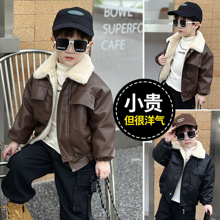 子拱服 アウター カーディガン男の子のジャケットは革のジャケット冬の子供ウサギの毛皮のベルベットの厚くされたバイカーの服小さな子供の暖かい防風コートの潮を厚くした