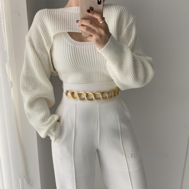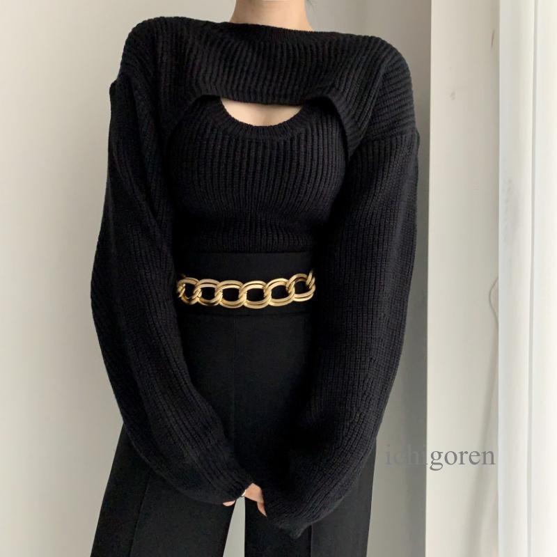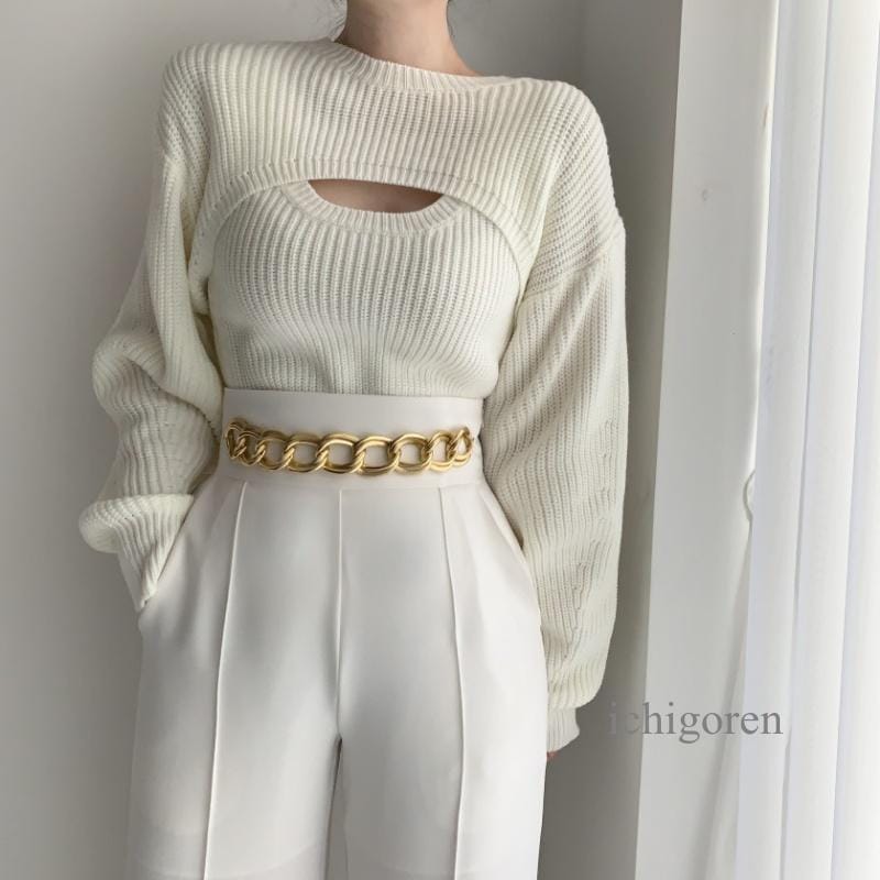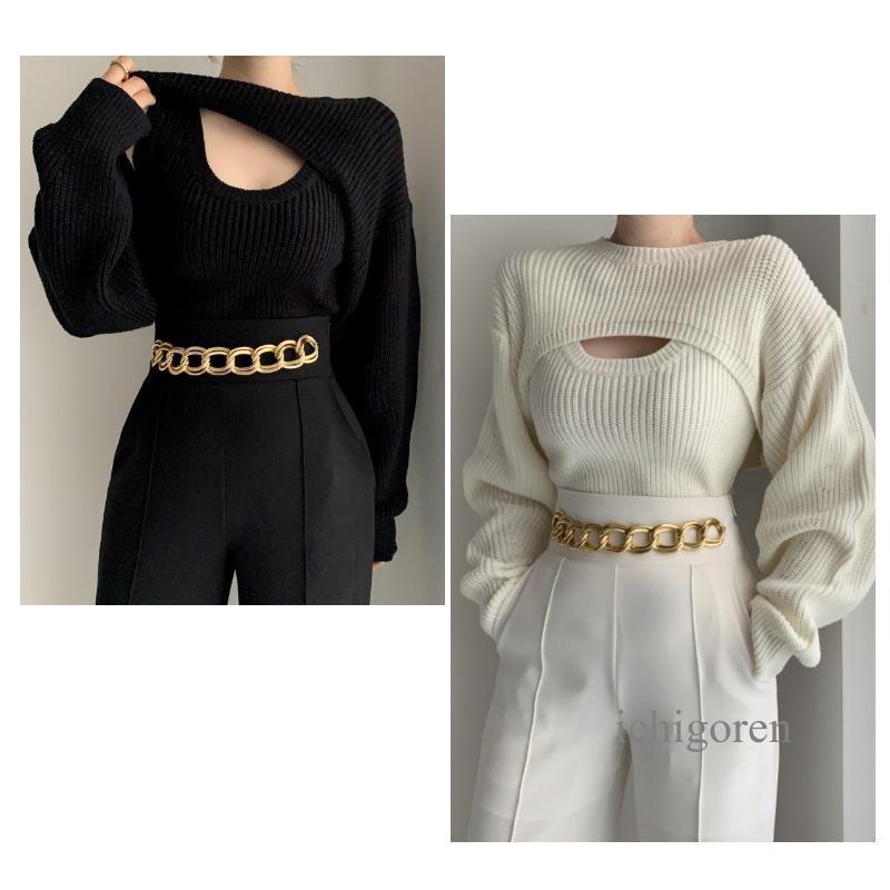 短丈ニット タンク アンサンブル レディース ショート丈 セーター 白 黒 ニット トップス 秋 冬 おしゃれ 韓国 きれいめ コンサバ ニット
