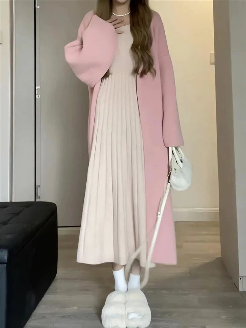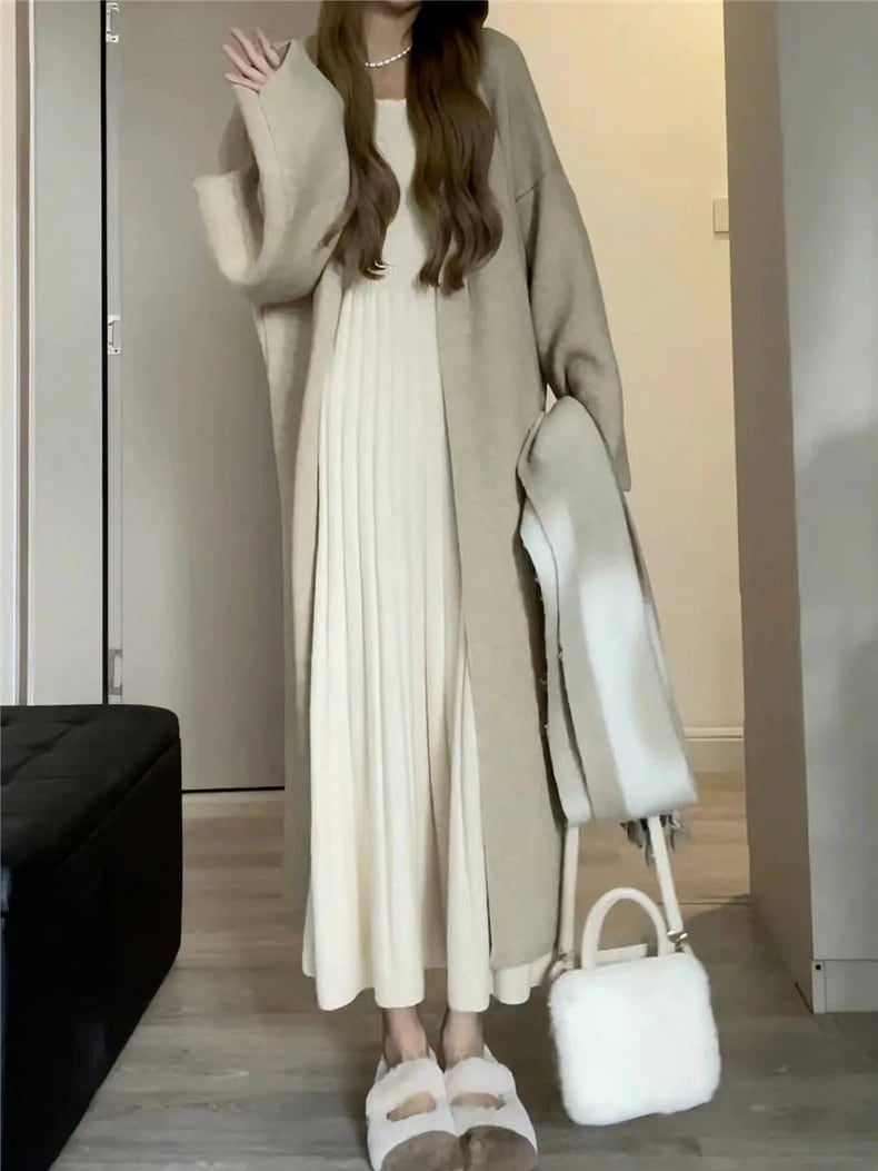 2024秋冬デザイン感ニットロングワンピース 冬のワンピース レース 高級感 ゆったりおしゃれ 気質ワンピース ニットワンピ