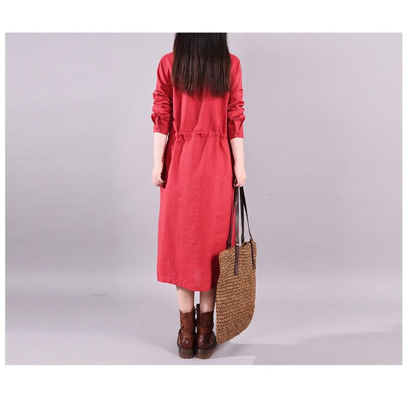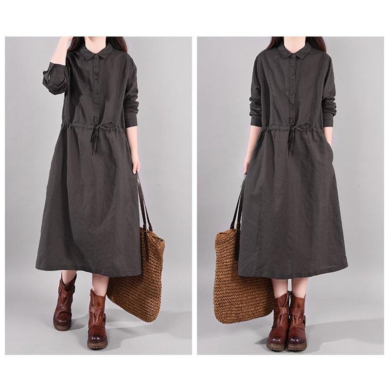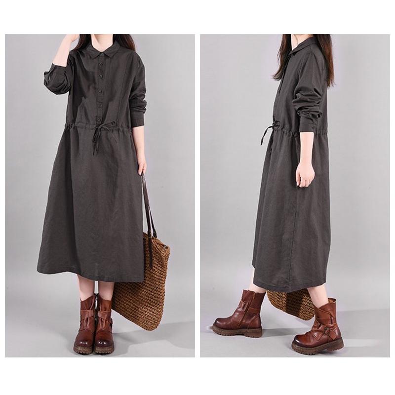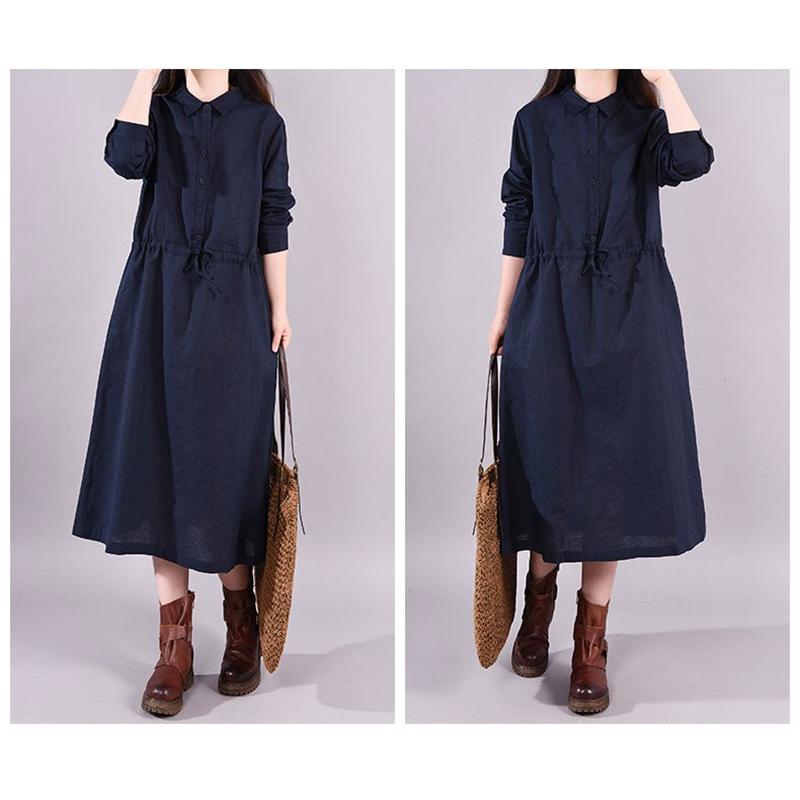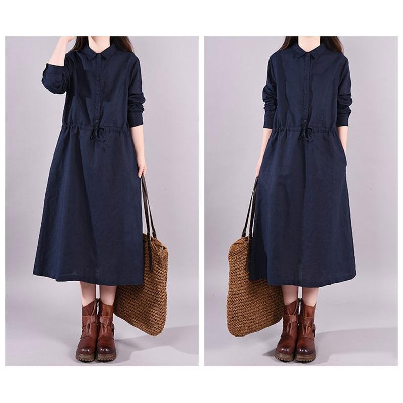 ワンピース ロングワンピース レディース 長袖 襟付き ウエストリボン 折り襟 綿混 コットン混 ゆったり 大きいサイズ 無地 着痩せ カジュアル風 春 秋 30代