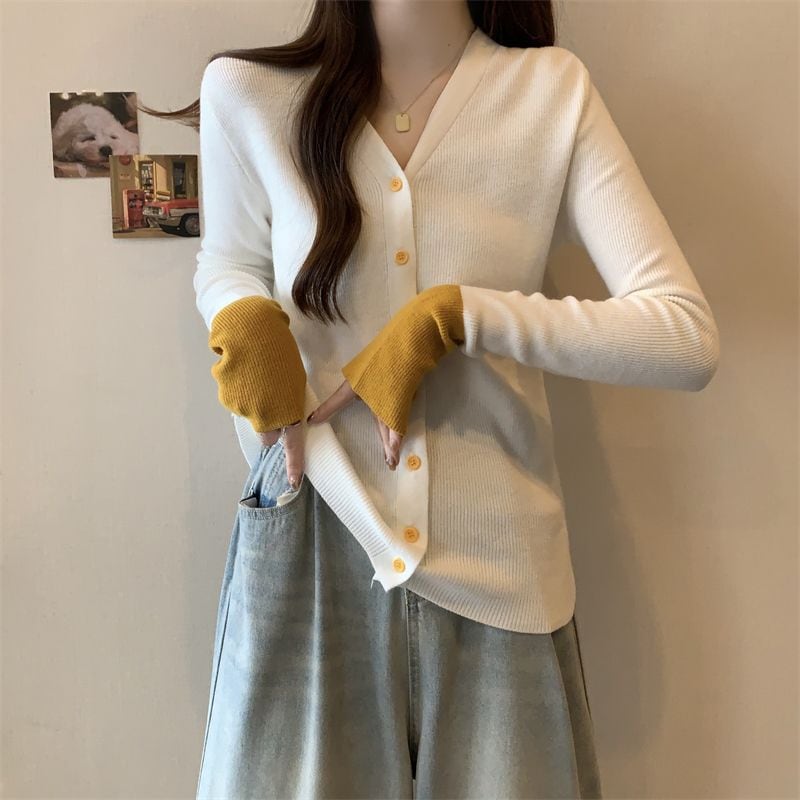 ニット Vネックカーディガン 配色ニット カーディガン レディース バイカラー ニット vネック トップス 長袖 ニットカーディガン 配色 vネックニット