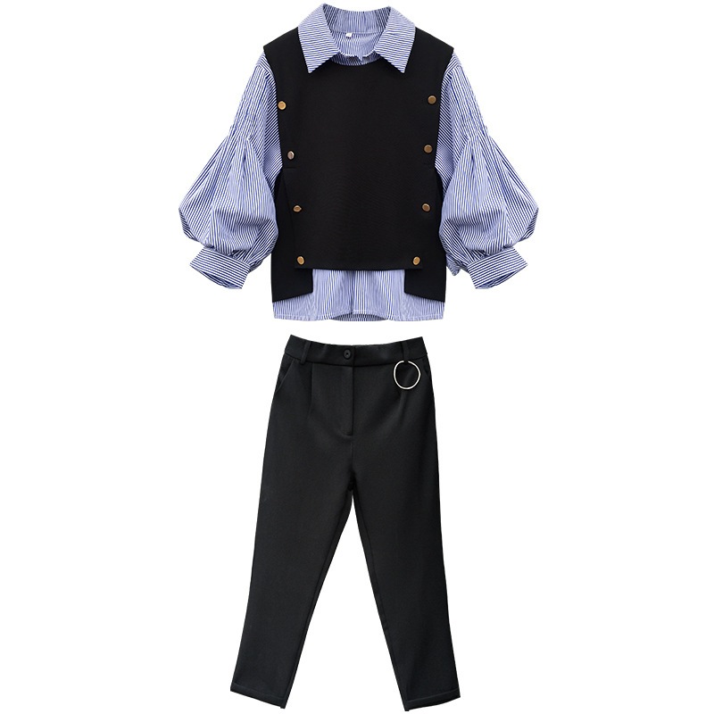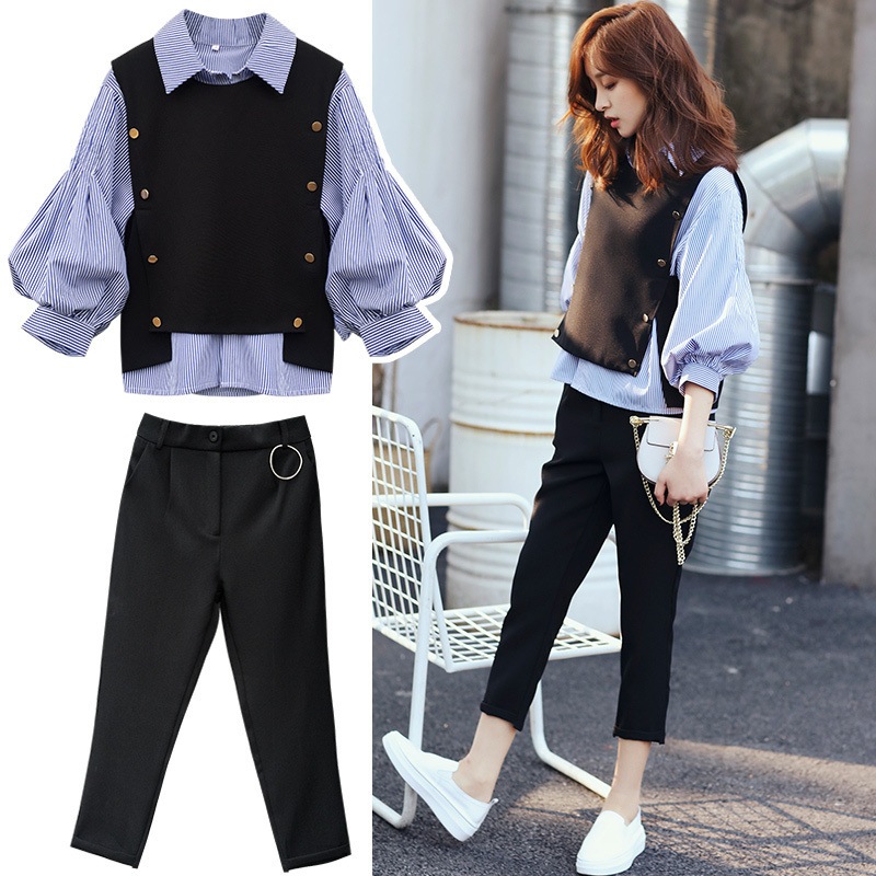 セットアップ セットアップ 韓国ファッション 三点セット 上下セット ニットタンクトップ 長袖 ストライプシャツ ストレート 弾力 おしゃれ