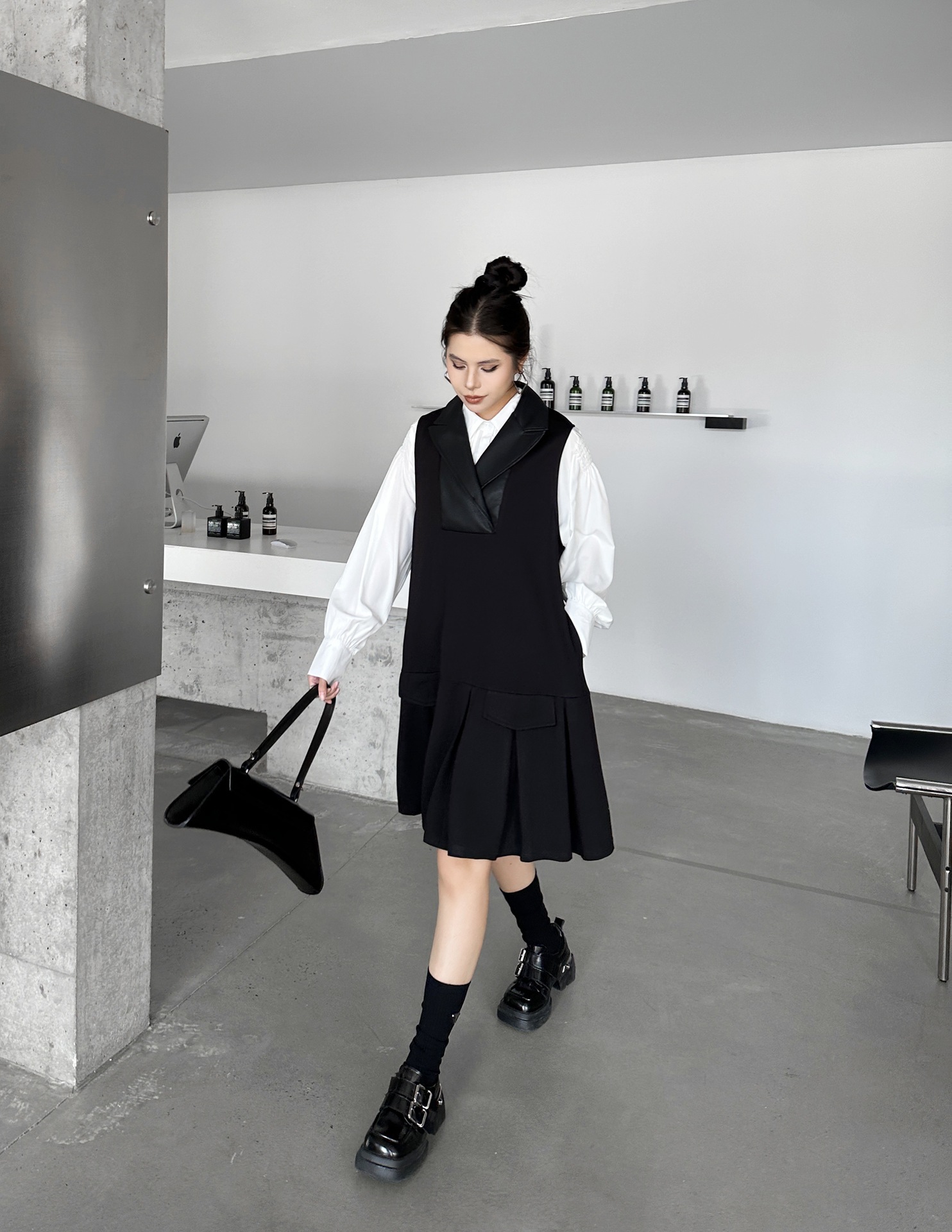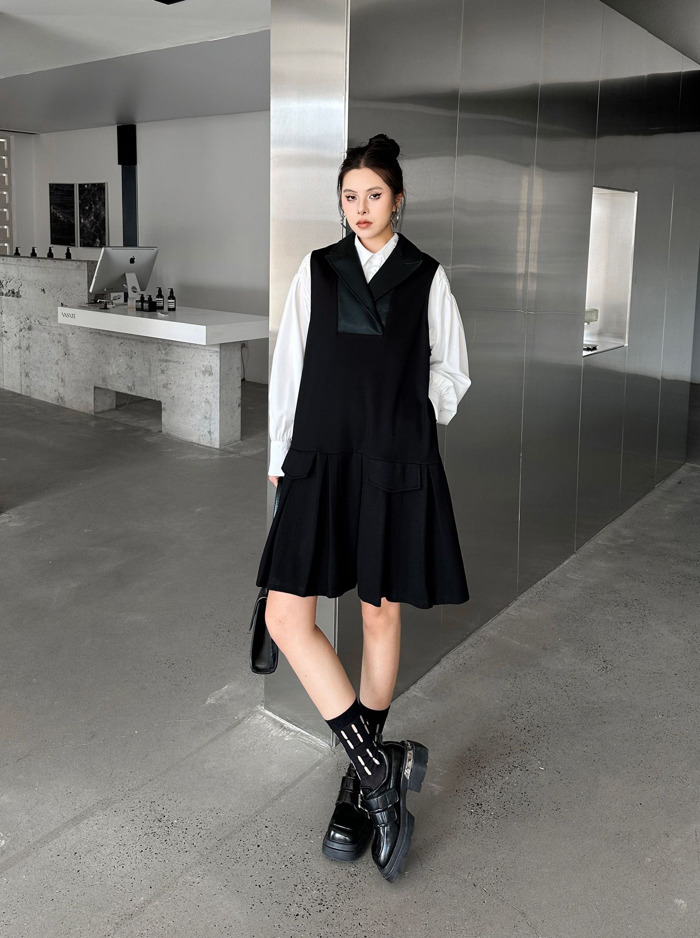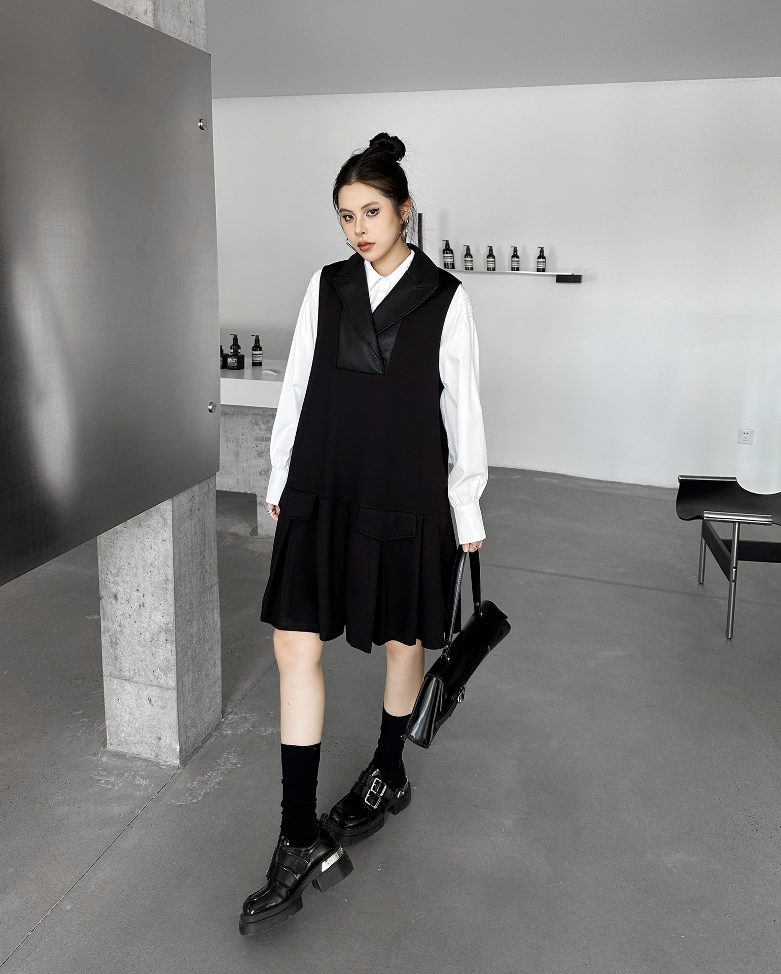 2025春 ミドル丈 ワンピース PUレザードッキング おしゃれ レディース 関連商品購入可能 メガ割 袖なしミニ 膝丈ワンピ