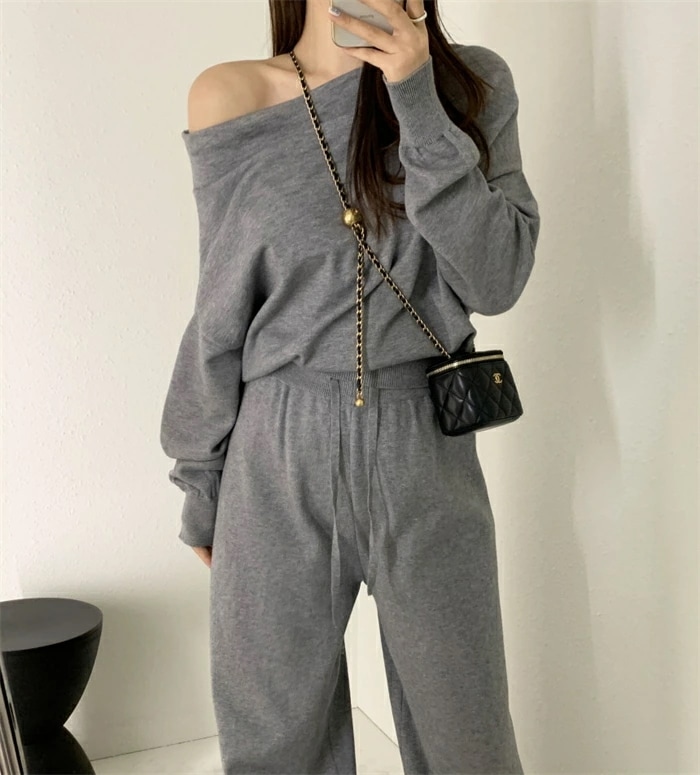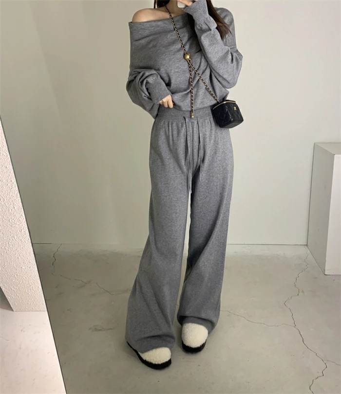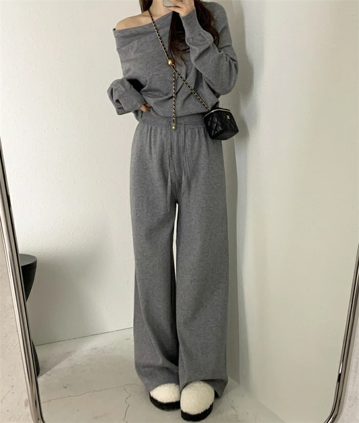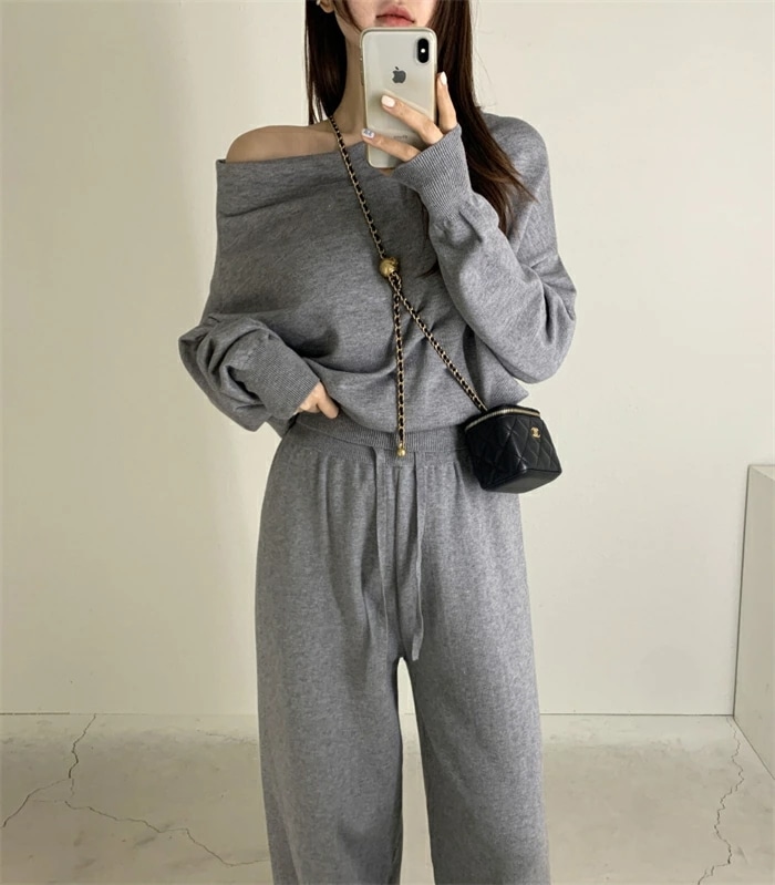 セットアップ トップス パンツ レディース 秋 冬 長袖 ニット セーター ニットパンツ セーター ロングパンツ 上下2点セット オフショルダー 無地 カジュアル セクシー リラックス 春秋 柔らかい