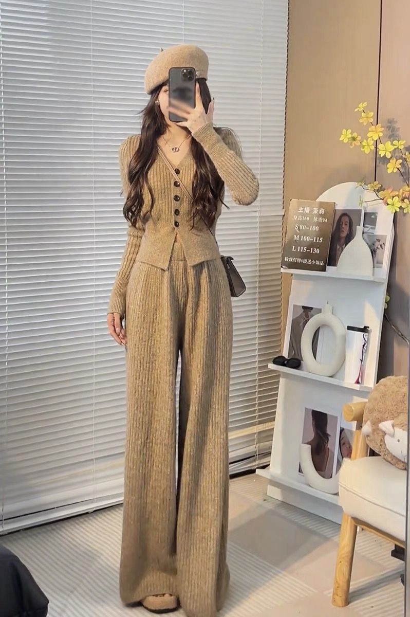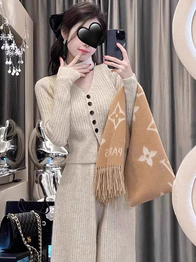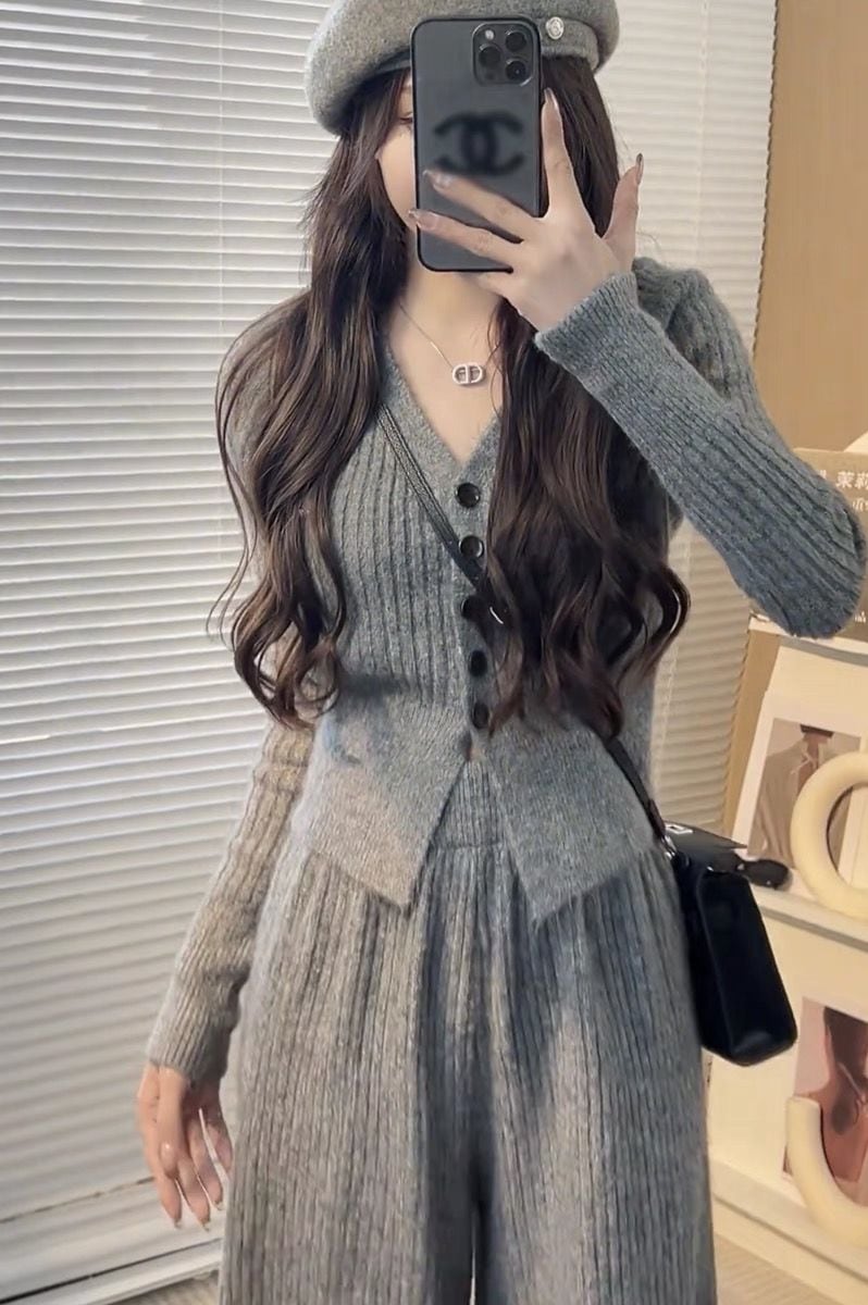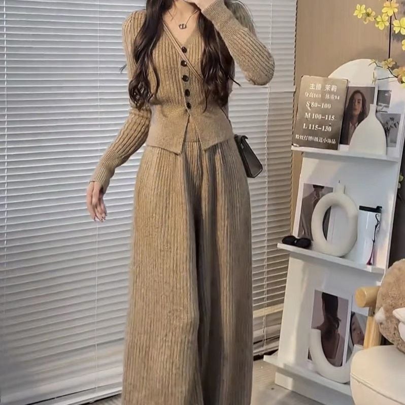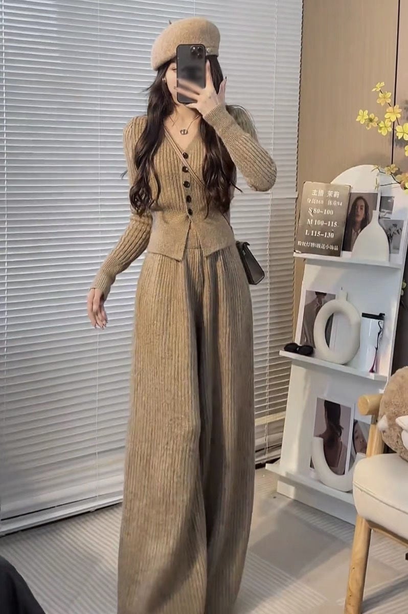 ニットセット vネック 上下セット トップス+パンツ カジュアル 3色 レディース セットアップ セットアップ