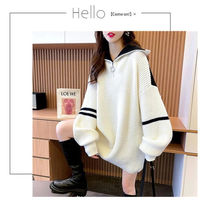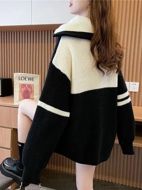 厚手 セミロング タートルネック polo セーター レディース ゆったり 怠惰風 ジ ップアップ コントラストカラー 上着 ニットカーディガン