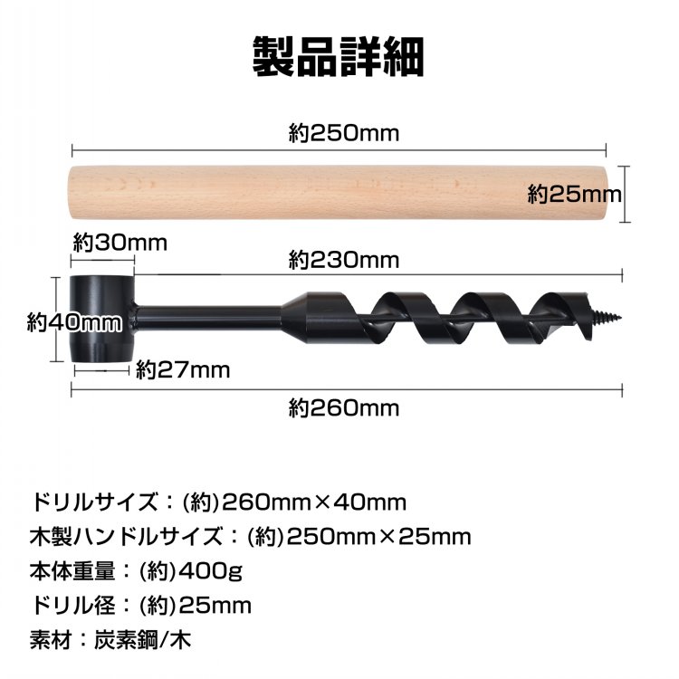 ウッドオーガードリル ハンドツール ブッシュクラフト ドリルビット ドリル径25mm 高精度ドリル刃 炭素鋼製 耐久性 木製ハンドル付き 穴掘り アウトドア ハイキ