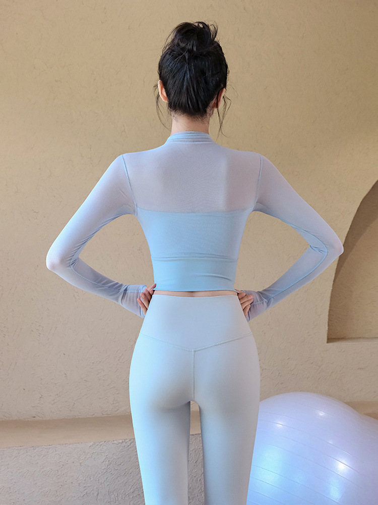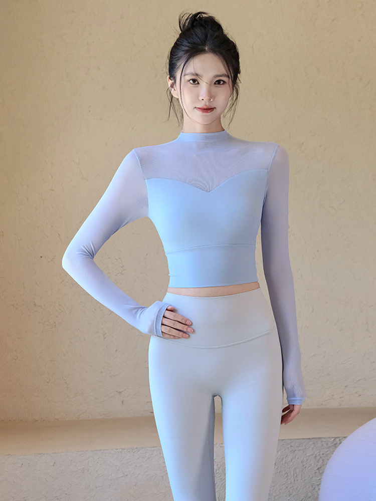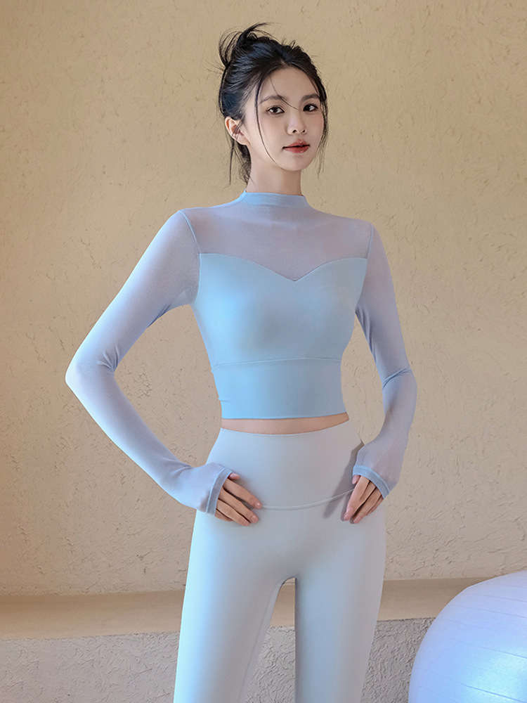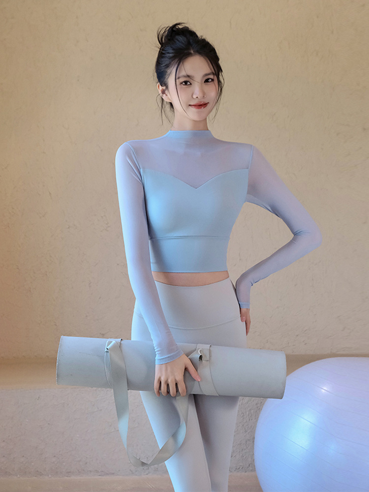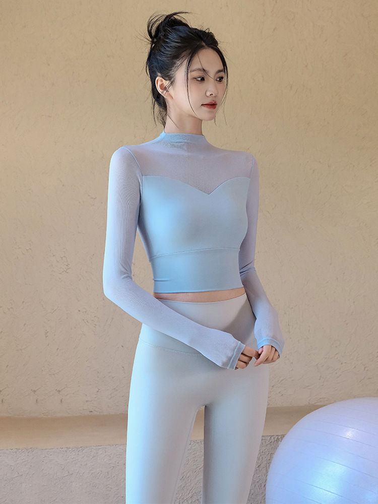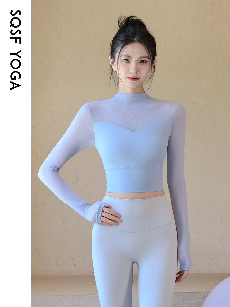 お家ヨガウェア 胸パッド付き レディース メッシュ フェイク ツーピース アスレチック トップス ピラティス トレーニング フィットネス 長袖Tシャツ おしゃれヨガウェア