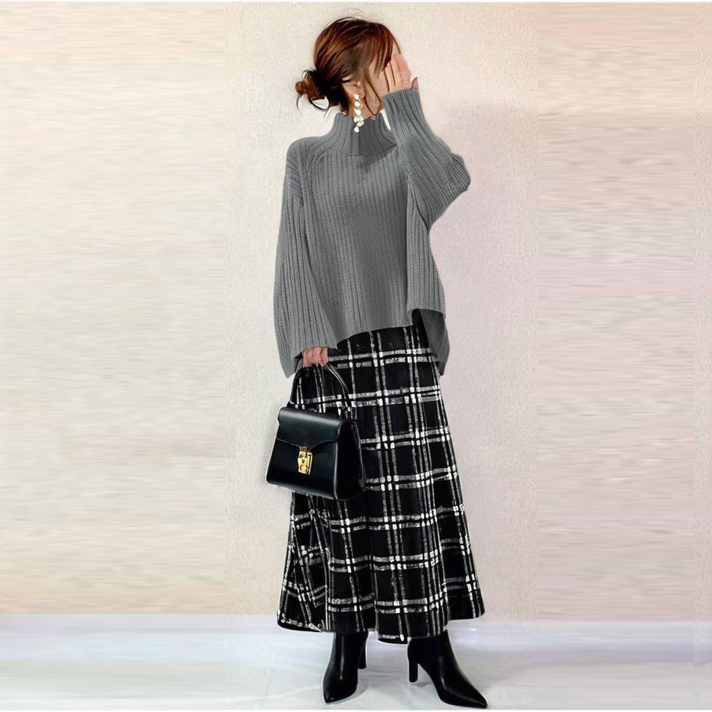 2点セット 上品 ハイネックゆったりグレーセーターチェック半身スカート 新作 大人 お洒落 気質 通勤OL その他 ワンピース ドレス