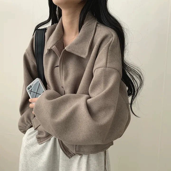 ジャンパー ブルゾン 韓国chic秋冬フレンチ減齢だるいダブルポケットファスナー襟抜きロープ収納ウエストショート丈コート女性痩せ見え ジャンパー ブルゾン