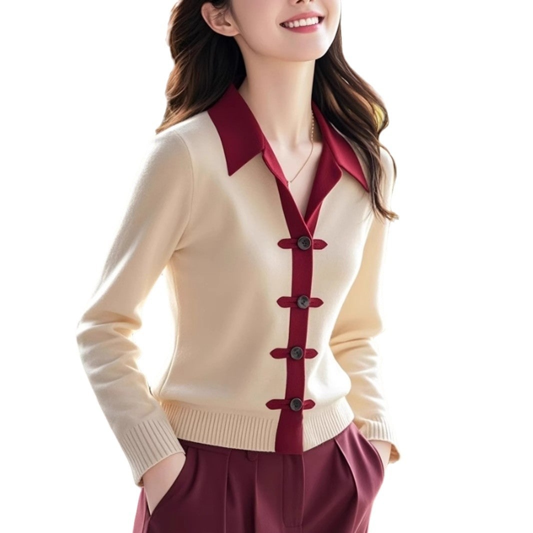 ニットカーディガンポロ襟衝突色のニットセーターの女性2025冬の新しい気質野生の頭の長袖ジャンパー小さなシャツ セーター ニット セーター