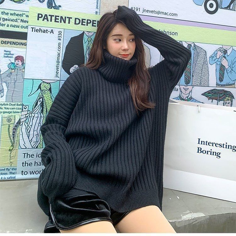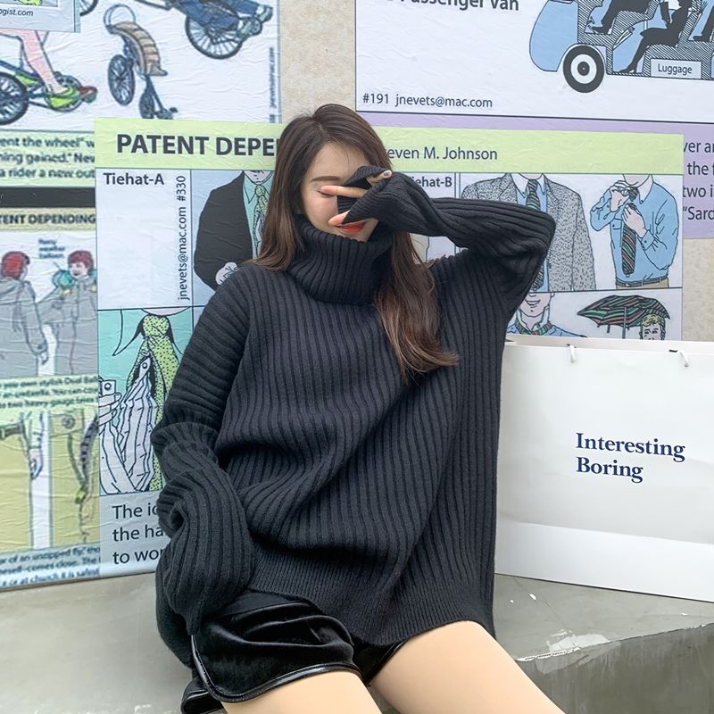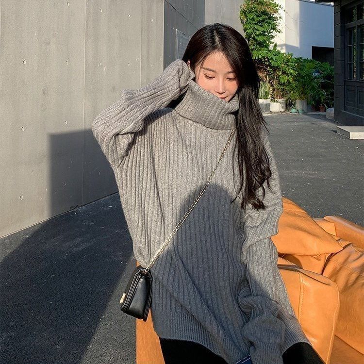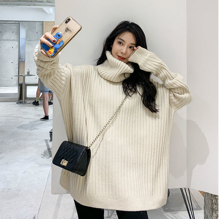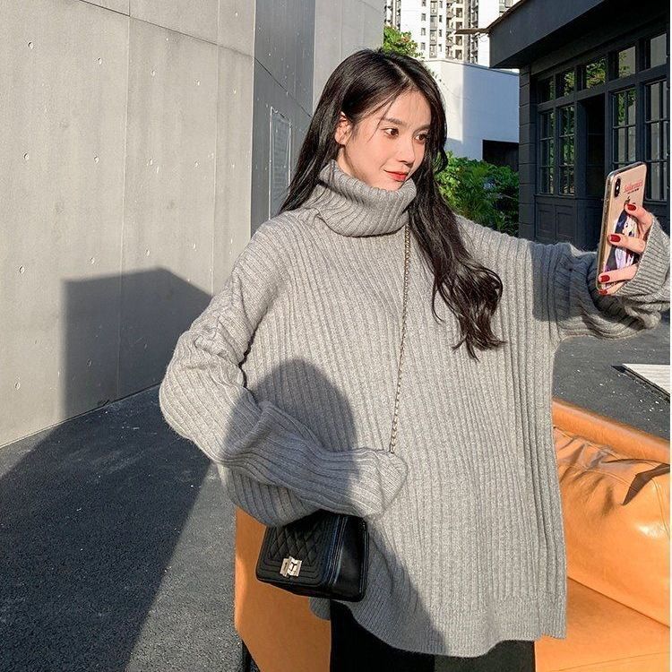 ブラウスハイネックセーターレディースミディアム丈厚手ゆったり外着秋冬新作けだるい風洋風白ボトムニットラブリータートルネックラウンドネックニットあったか カシミヤタッチロンT ベーシックニット