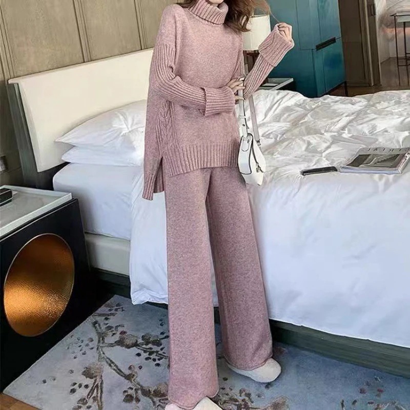 2024レディースニットセット秋冬新作 タートルネックセーター+ワイドパンツ ニット二点セット 怠惰な風 オシャレ 気質 上下レディースセット 通勤 長袖セーター ロングパンツ 二点セット