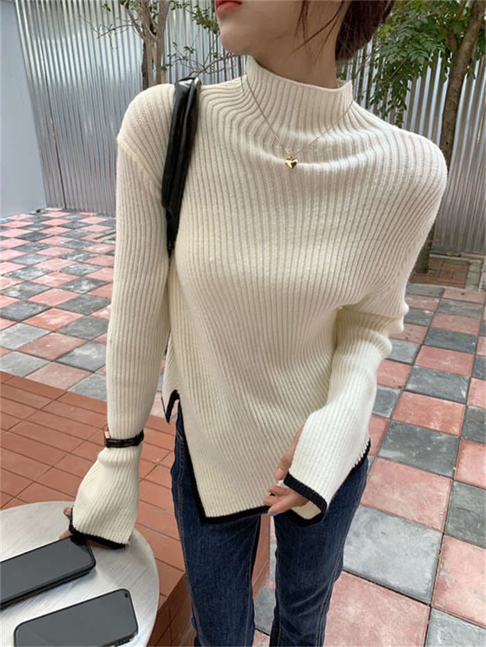 ニットセーター レディース ハイネック 長袖 無地 ニットウェア セーター トップス アシンメトリー カットソー きれいめ 配色 秋冬 リブニット プルオーバー 暖かい 防寒 カジュアル シンプル
