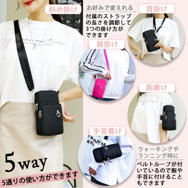 肩掛け、斜め掛け、首から掛け、腕に通して、手首に着けて全部で5WAYで使用できます。