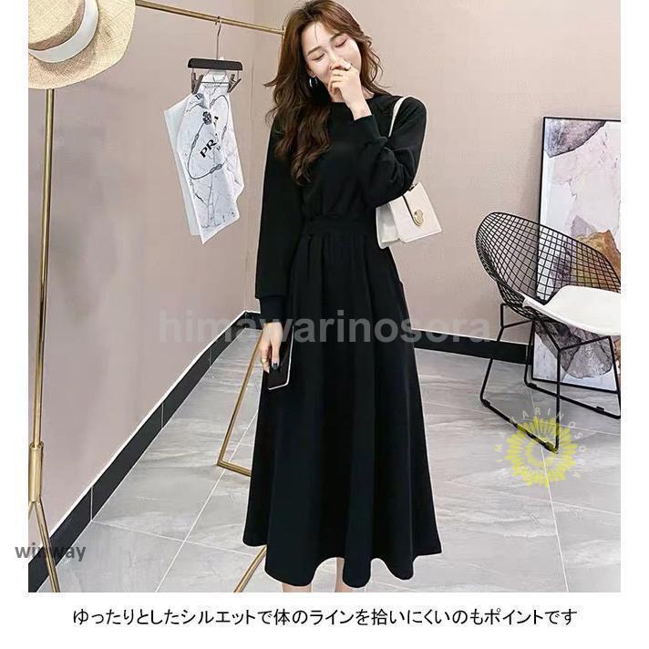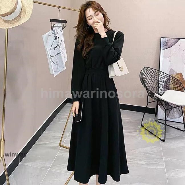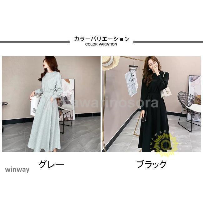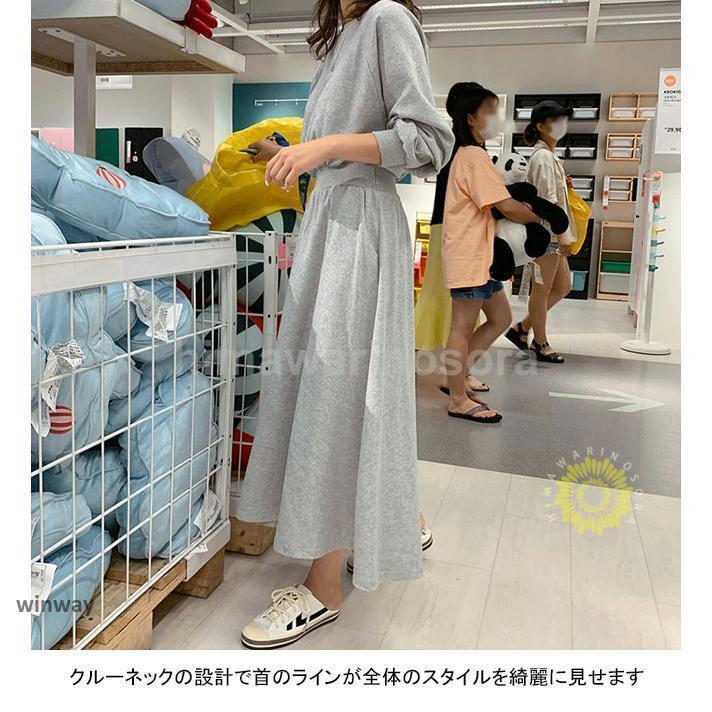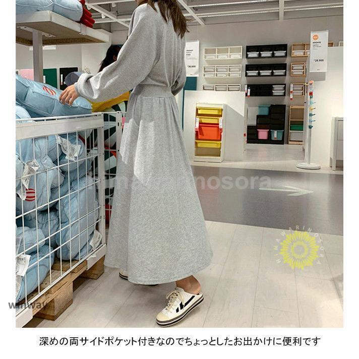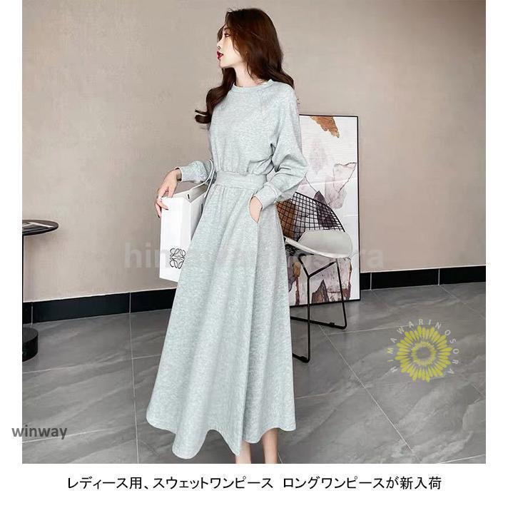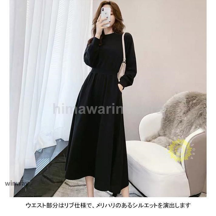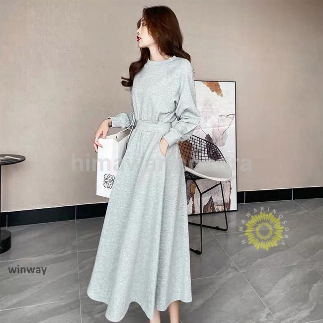 ロングワンピース レディース スウェットワンピース クルーネック 長袖 フレア ウエストリブ ポケット ゆったり 着回し春 秋 長袖ロング マキシ丈ワンピ
