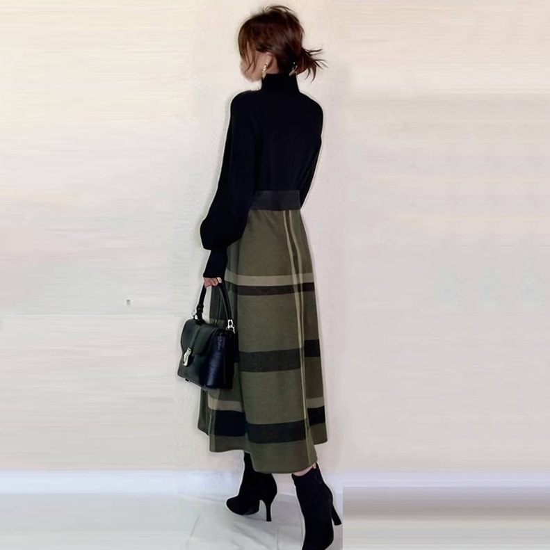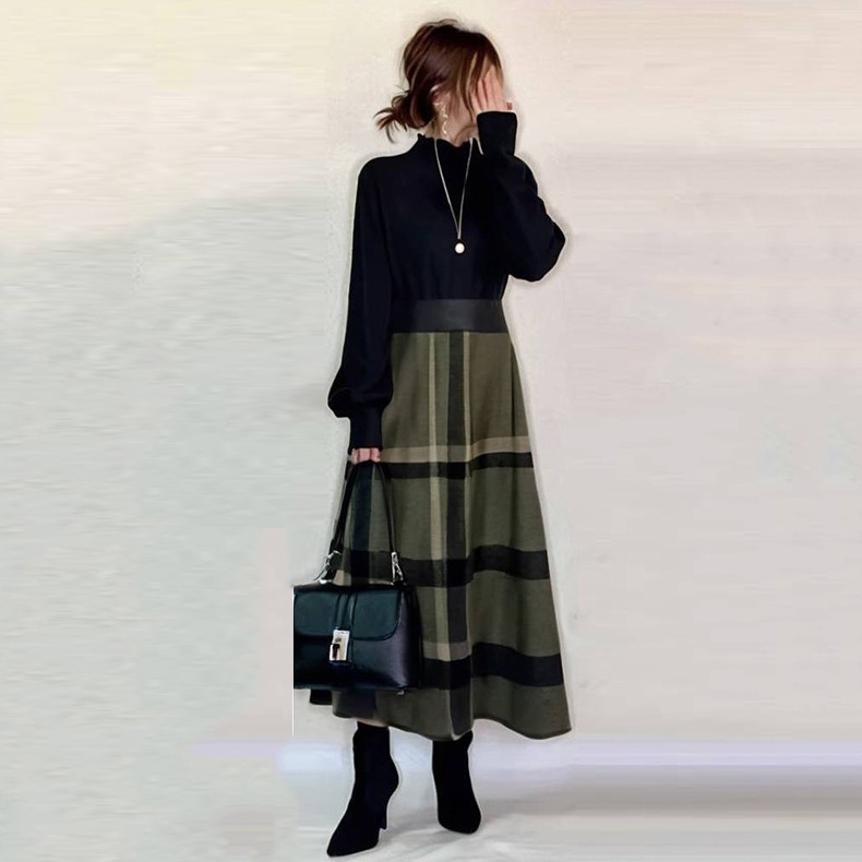 2025初春新品 日系 セーター ニットワンピース 切り替え ニット チェック 春 大きめサイズ ワンピース レディースファッション メガ割商品