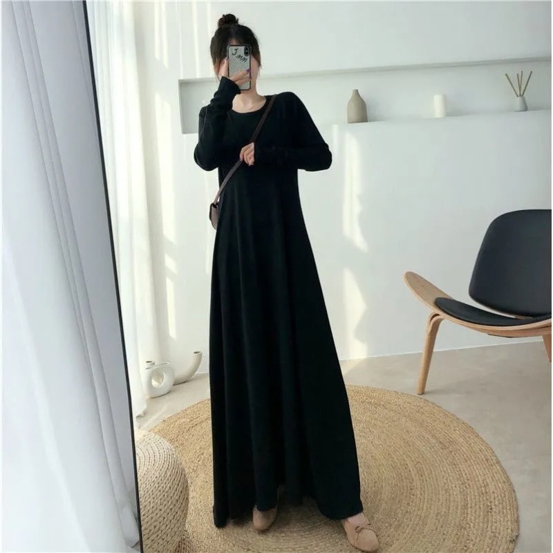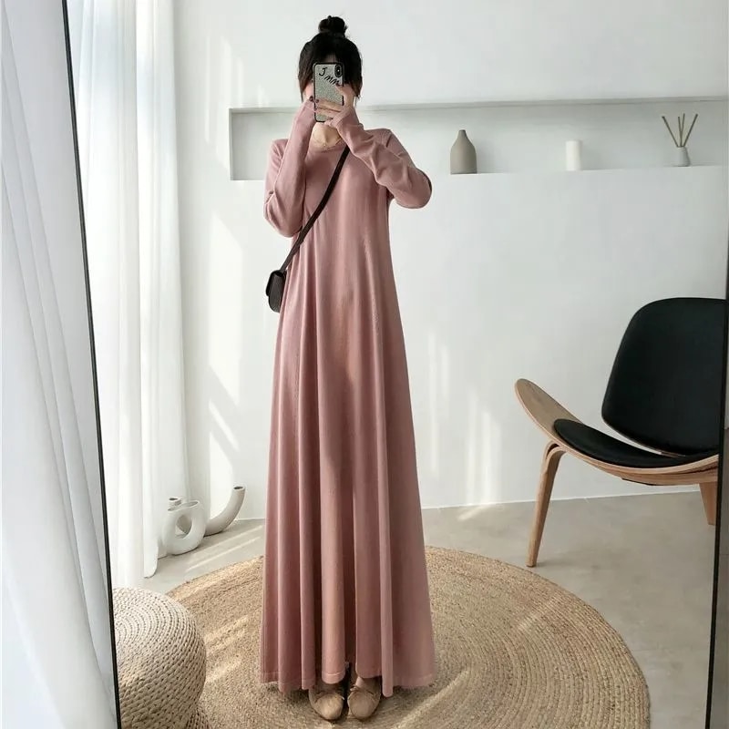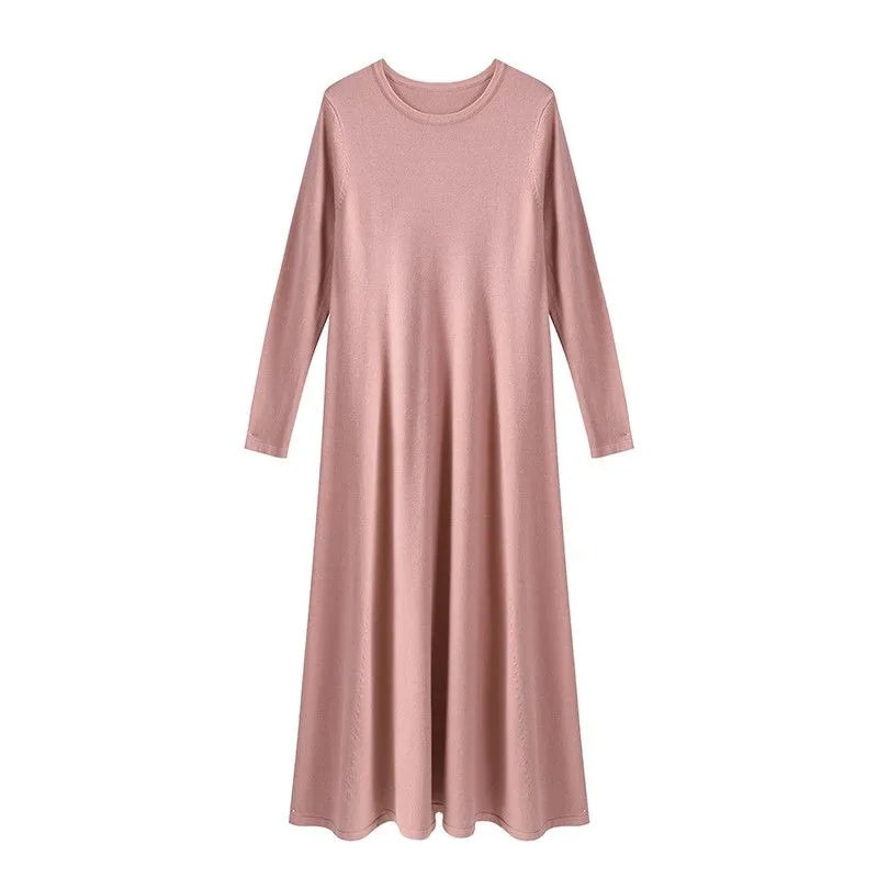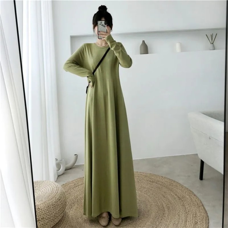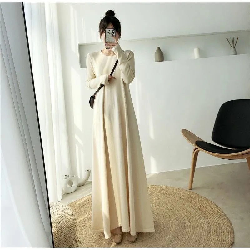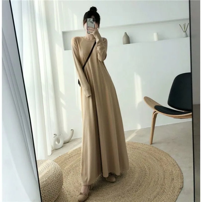 2025新入荷 韓国ファッション ワンピース 柔らかい お肌に優しい ロングワンピース さらさら 垂れ感 無地 気質 長袖 ニットワンピース ラウンドネック 大きいサイズ レディースファッション