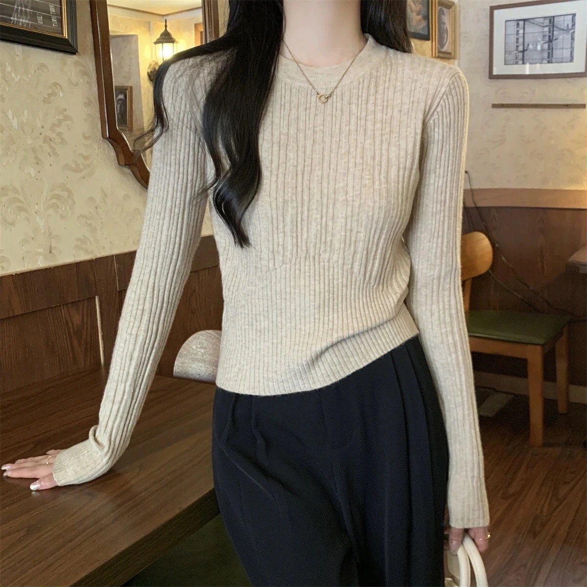 秋冬人気なリブニットシンプルカシミヤタッチ ニットセーター 百掛けトップス ニットインナー ベーシックニットゆったりスウェット 長袖 リブニット