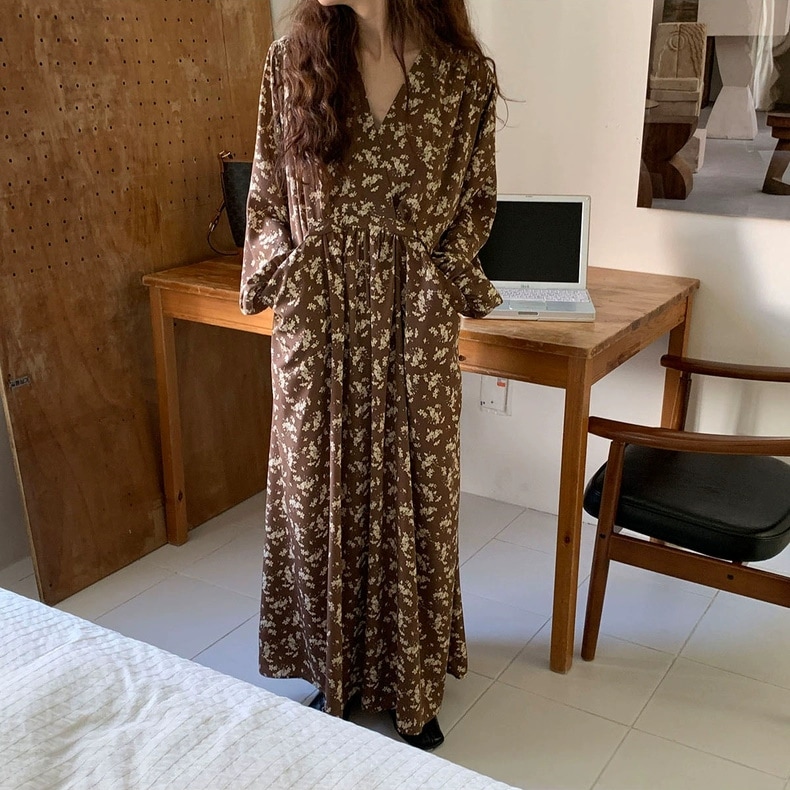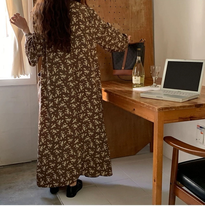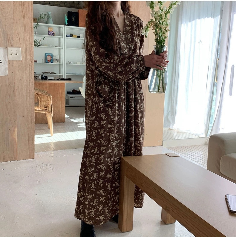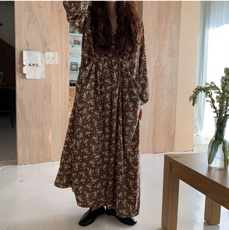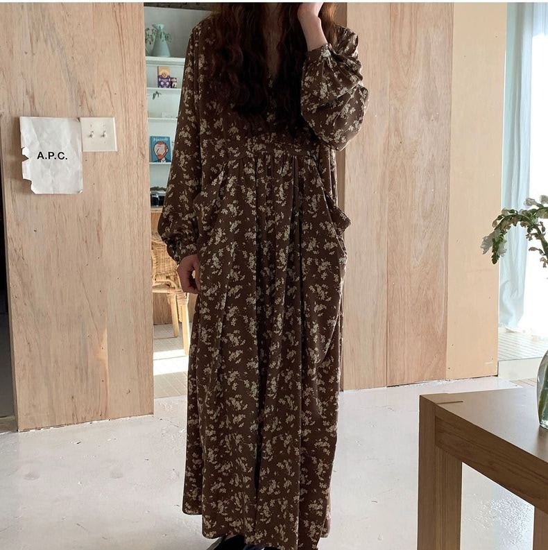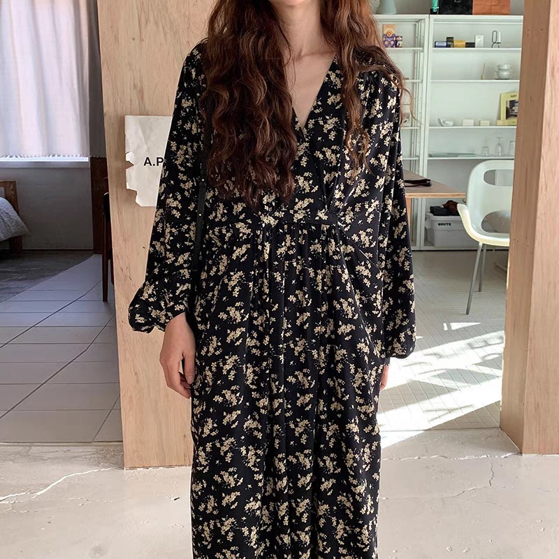meelissey韓国デザイン感秋レトロエレガントVネックフルスクリーン花ゆったり多彩な大きなポケット長袖ワンピース プリント 柄ワンピ