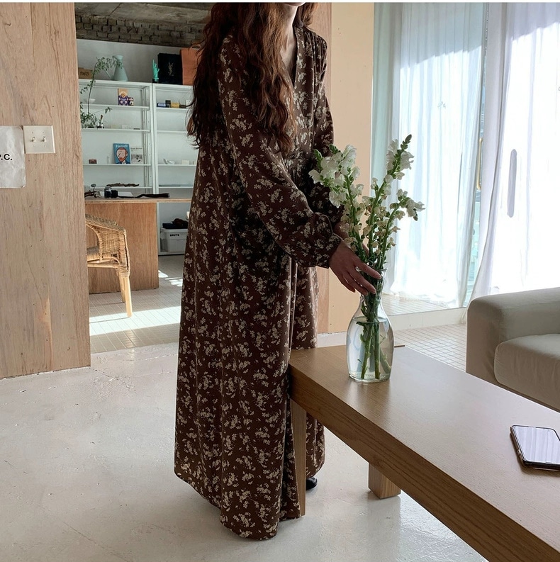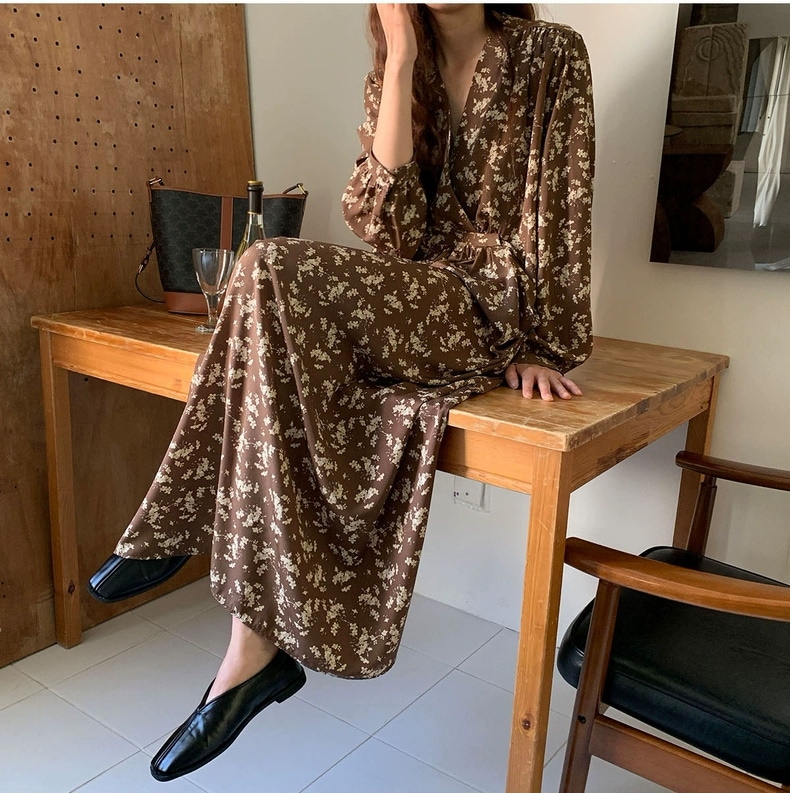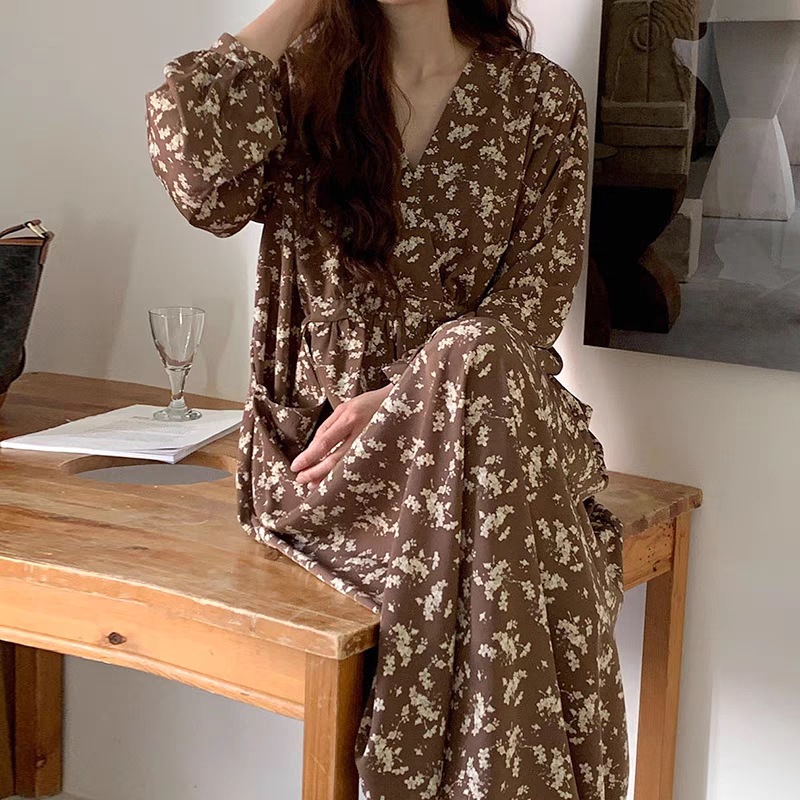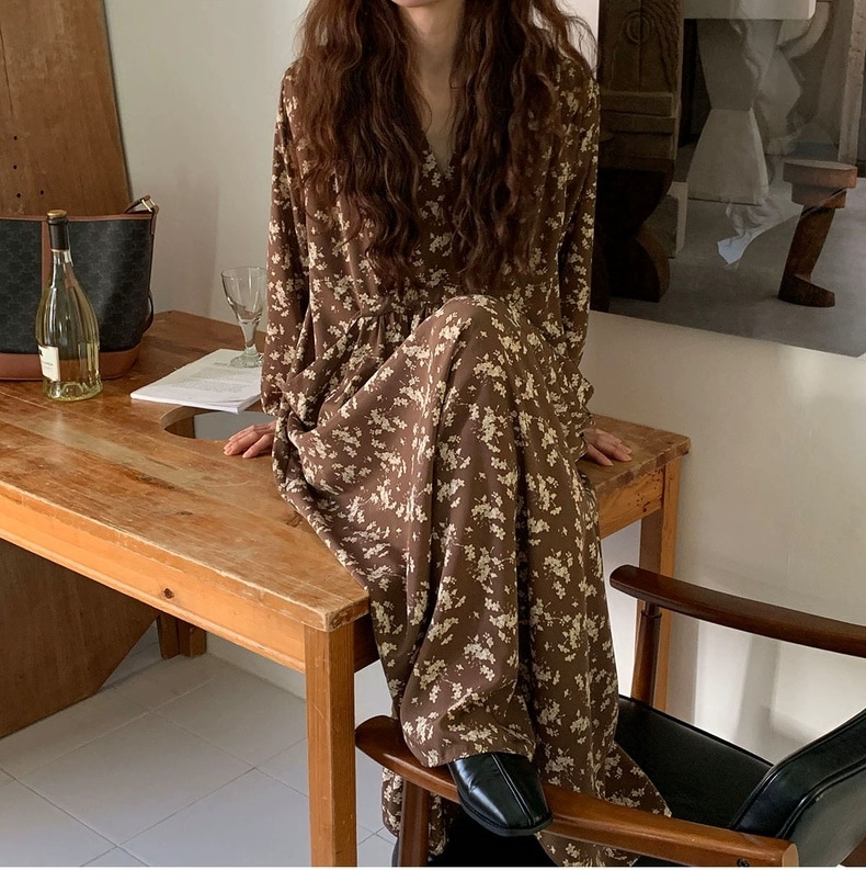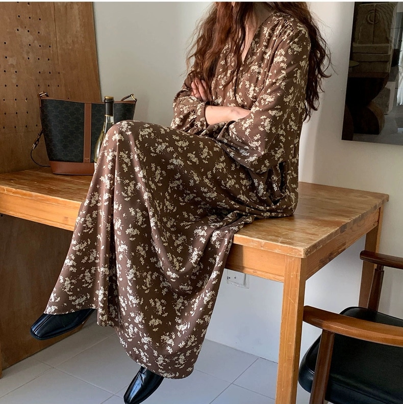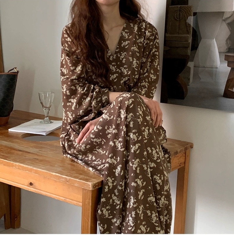 meelissey韓国デザイン感秋レトロエレガントVネックフルスクリーン花ゆったり多彩な大きなポケット長袖ワンピース プリント 柄ワンピ