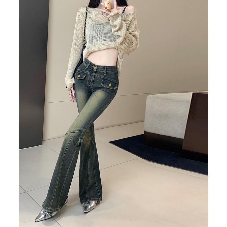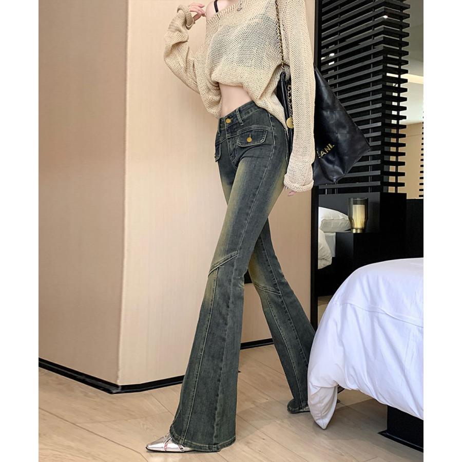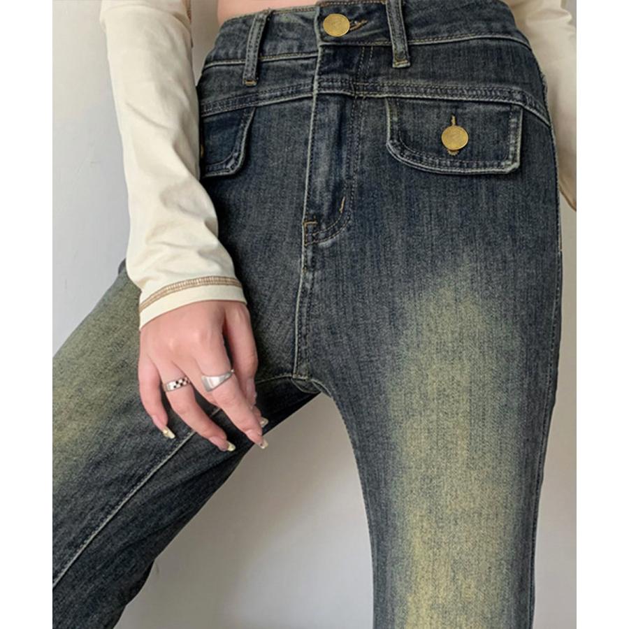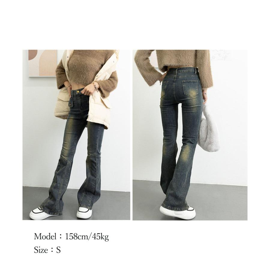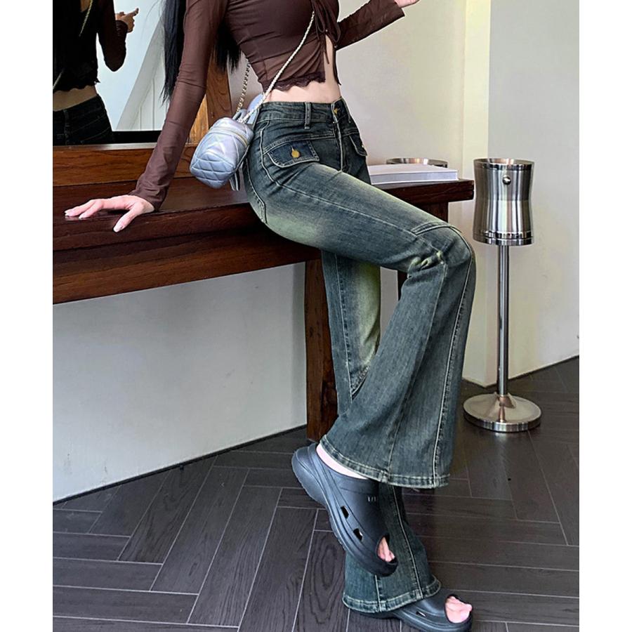 脚長効果 デニムパンツ レトロ セミフレアレディース ファッション デニム ジーンズ