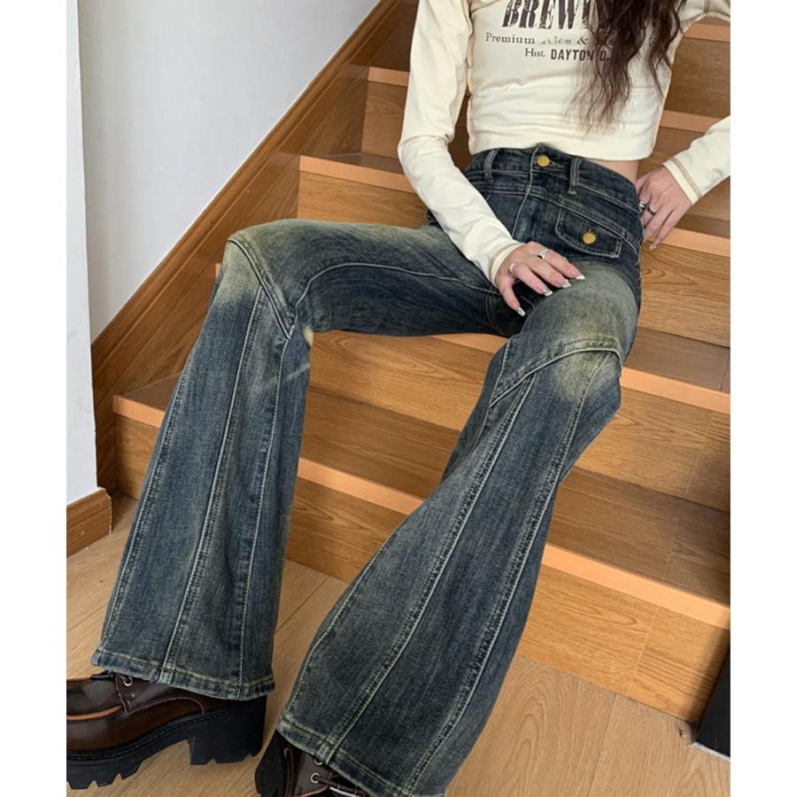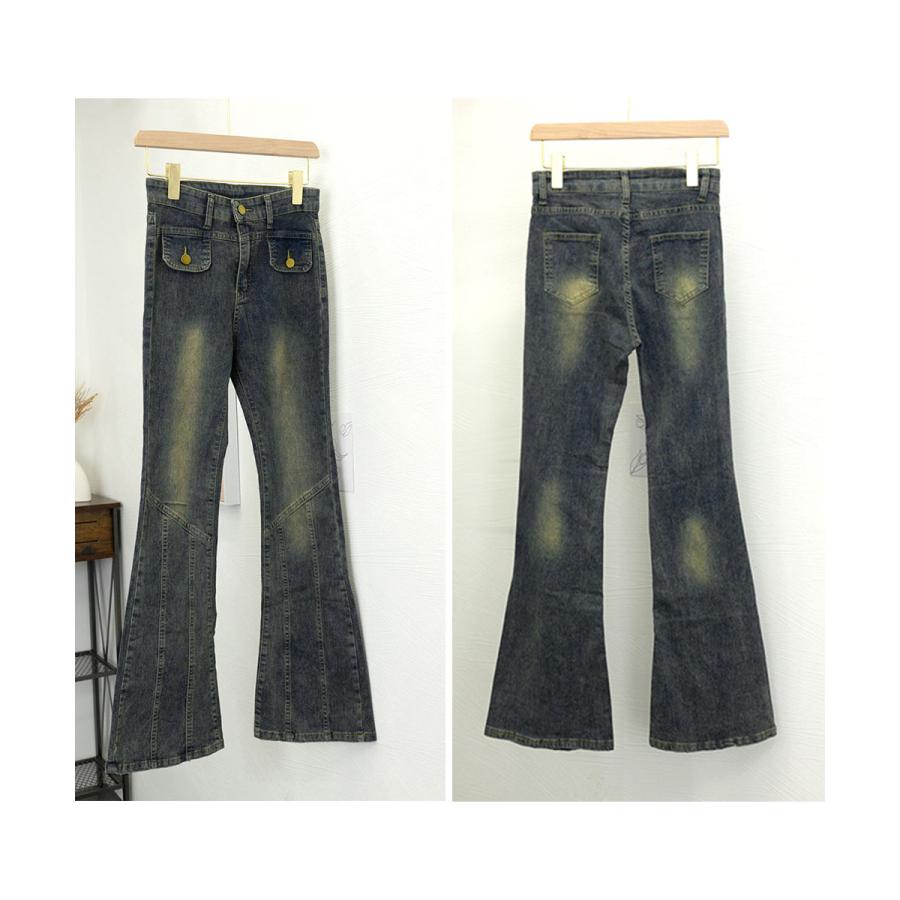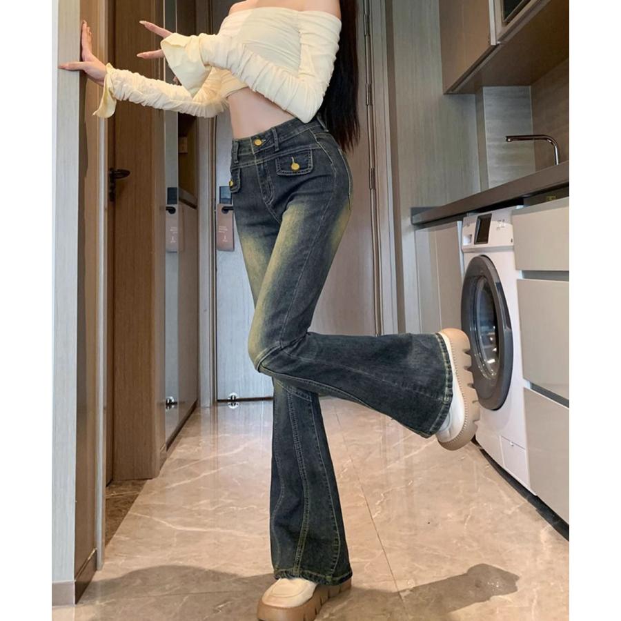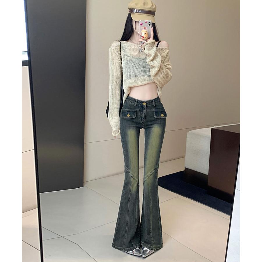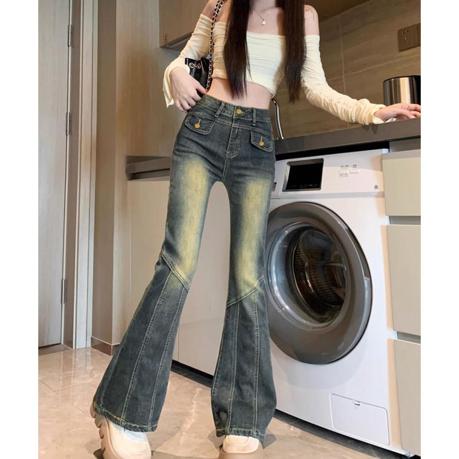脚長効果 デニムパンツ レトロ セミフレアレディース ファッション デニム ジーンズ