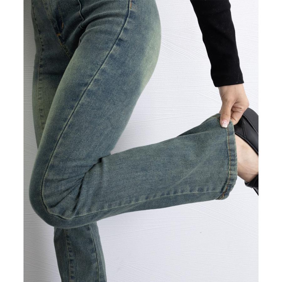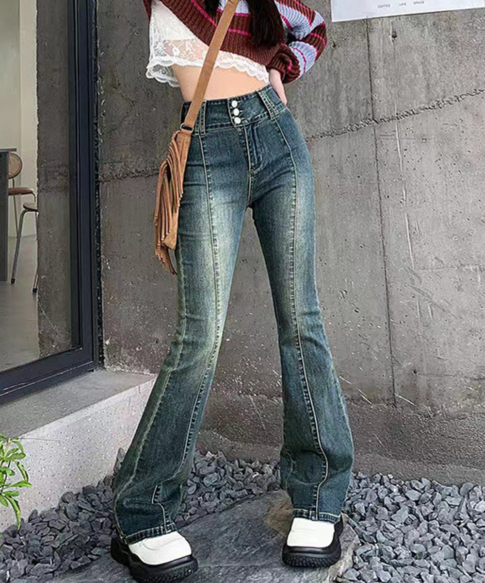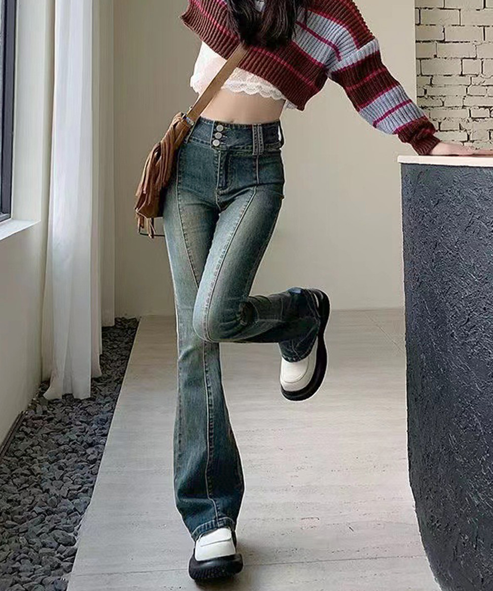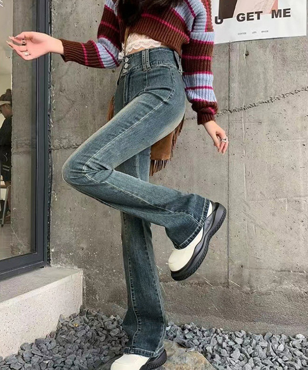 脚長効果 デニムパンツ レトロ セミフレアレディース ファッション デニム ジーンズ
