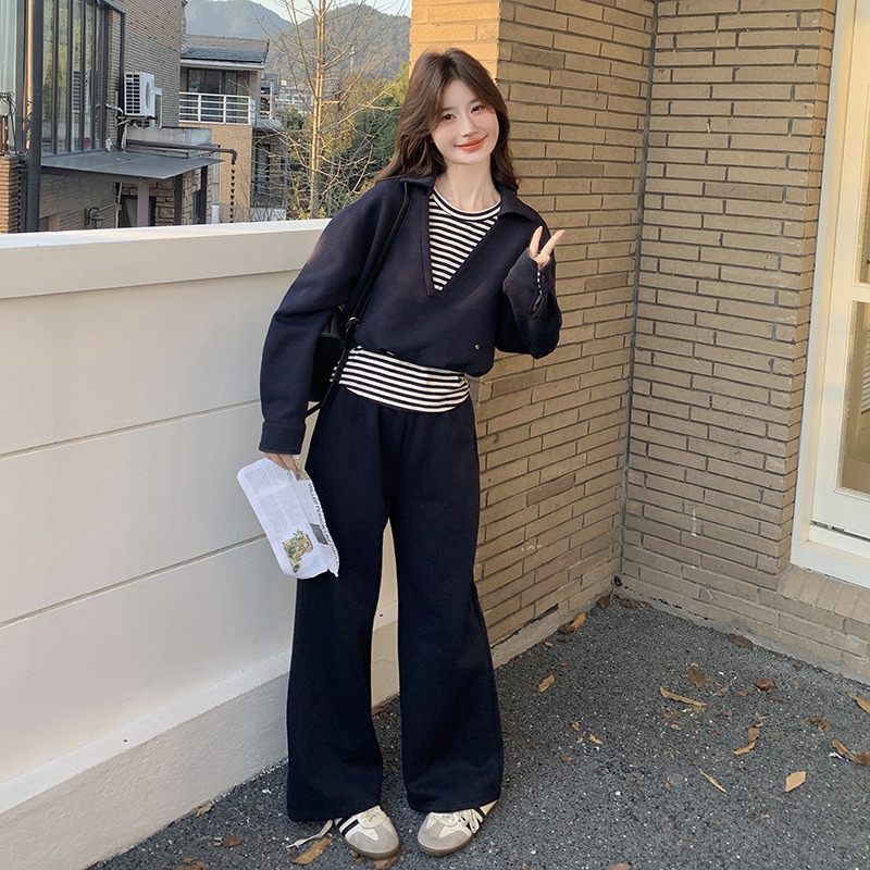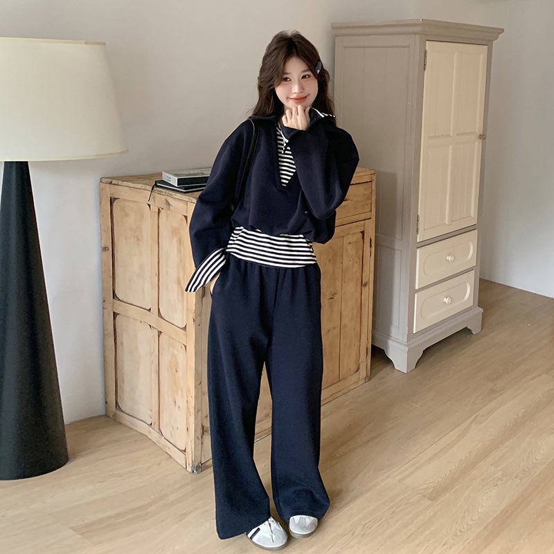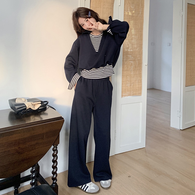 韓国のファッションストライプのスプライシング偽のツーピースセーターセット2025新しいカジュアルなズボンのツーピースセット セットアップ