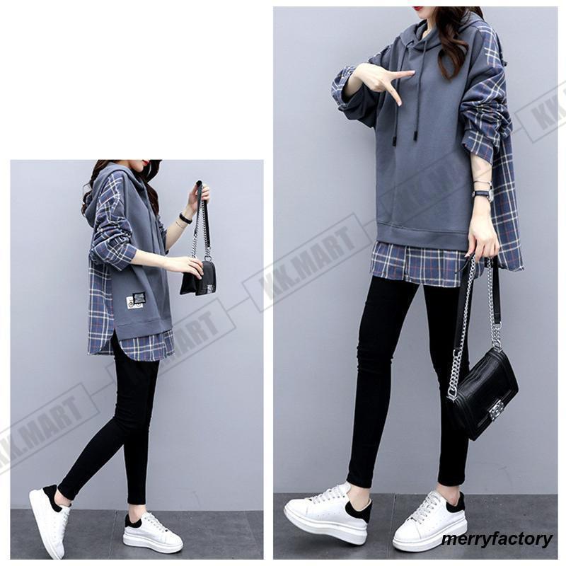 人気商品超目玉 パーカー レディース トップス スウェット 重ね着風 体型カバー チェック柄 レイヤード 羽織り フード付き トレーナー プルオーバー カジュアル