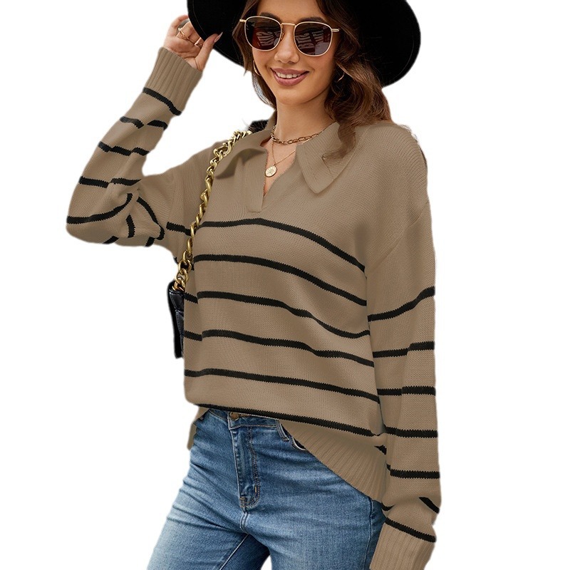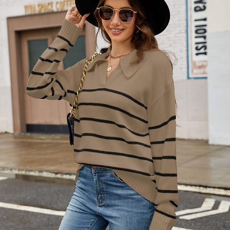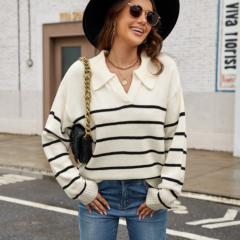 セーター 新作ストライプラペルプルオーバーニットジャンパー ニット