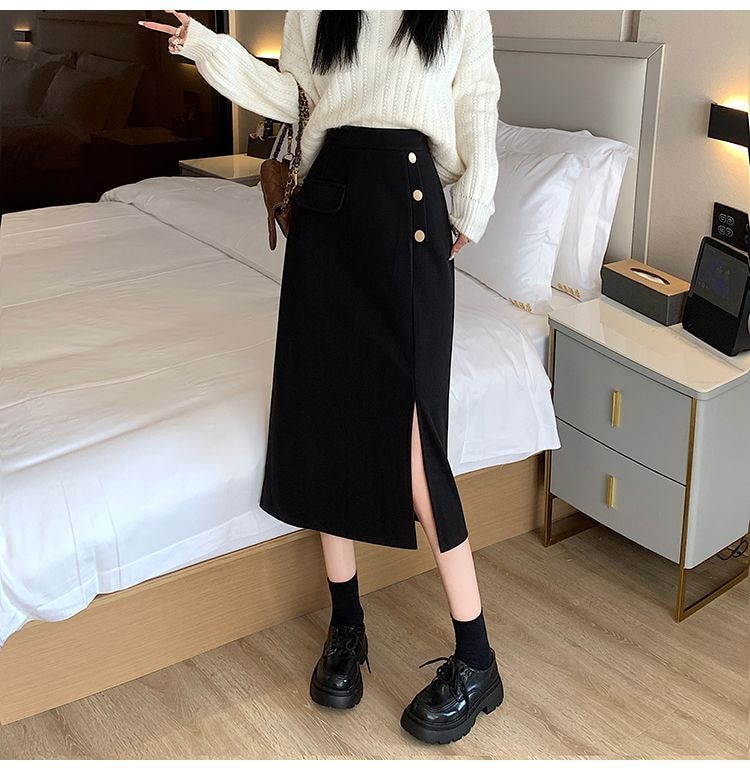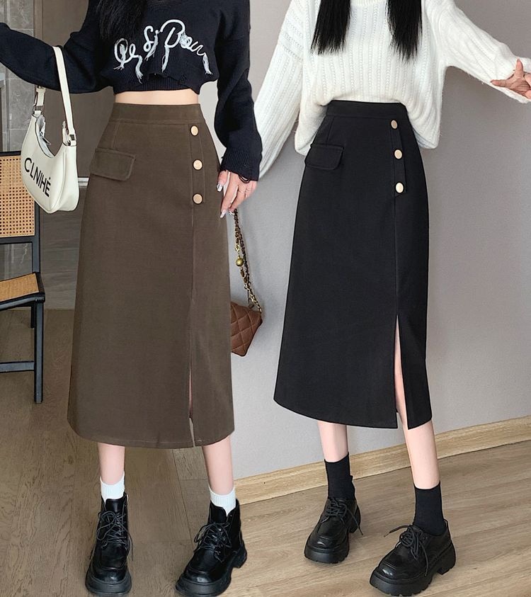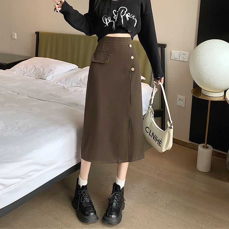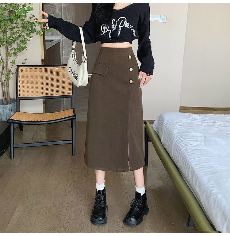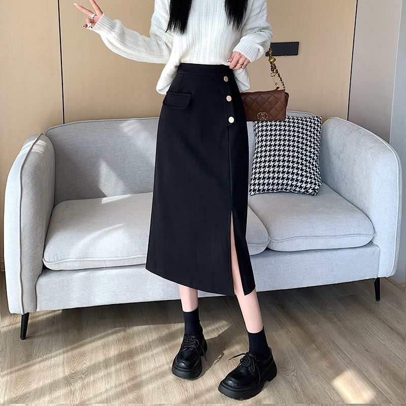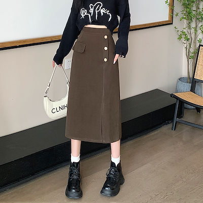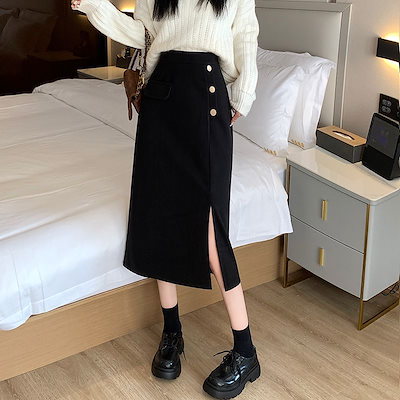 ハーフスカート レディース 韓国 マキシスカート プリーツスカート ツイードハイウエストスカート秋冬偽ポケットスリットで痩せ見えミディアムワンステップヒップスカート