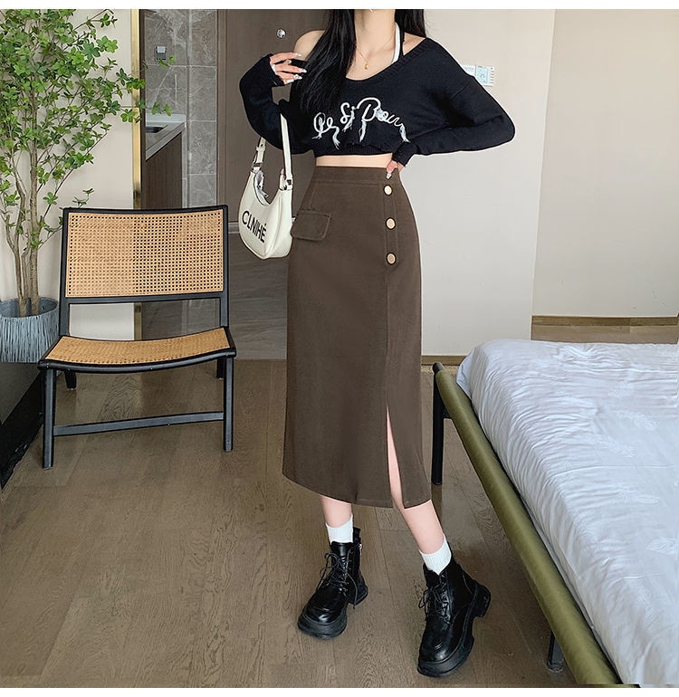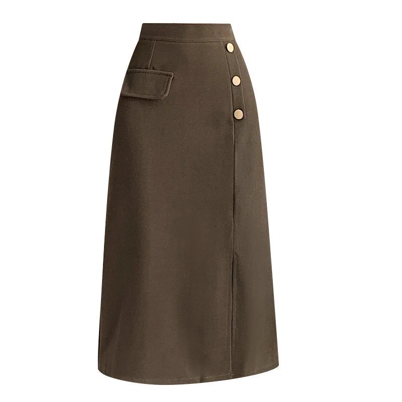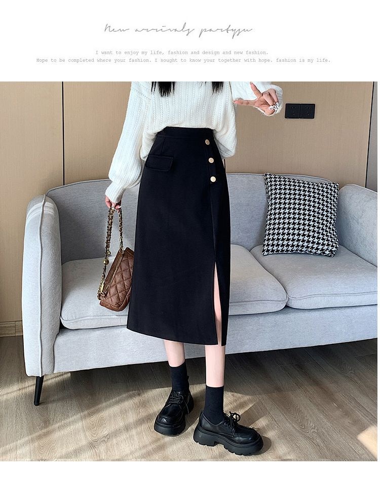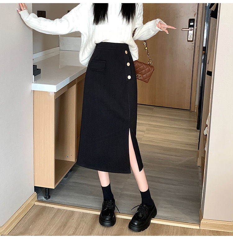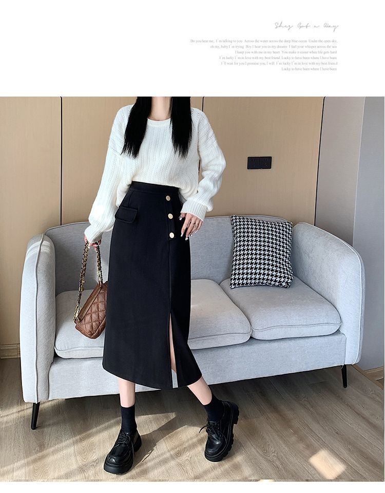 ハーフスカート レディース 韓国 マキシスカート プリーツスカート ツイードハイウエストスカート秋冬偽ポケットスリットで痩せ見えミディアムワンステップヒップスカート