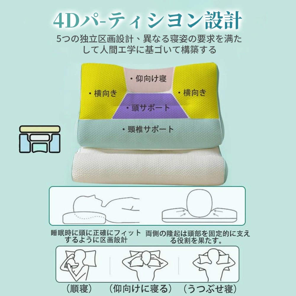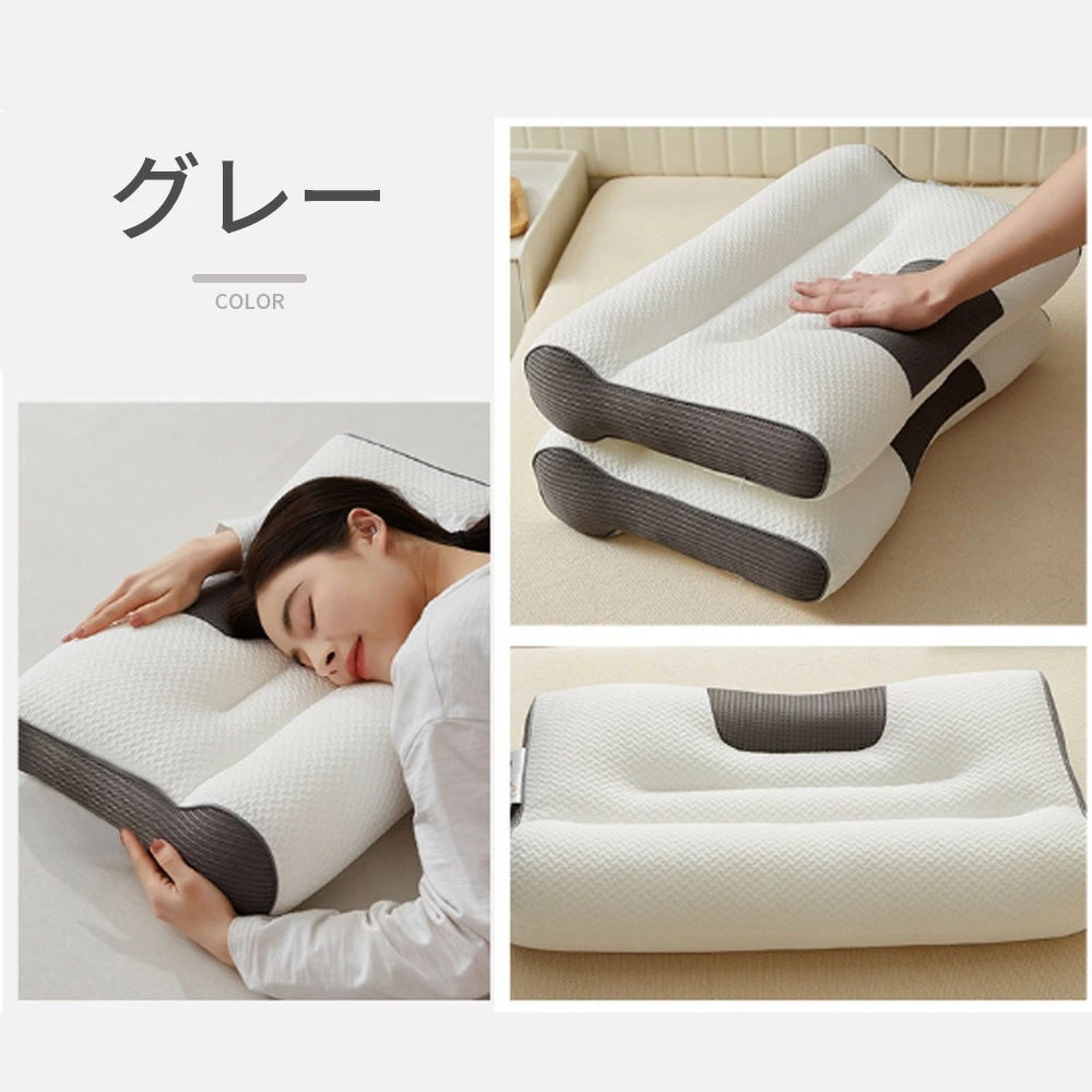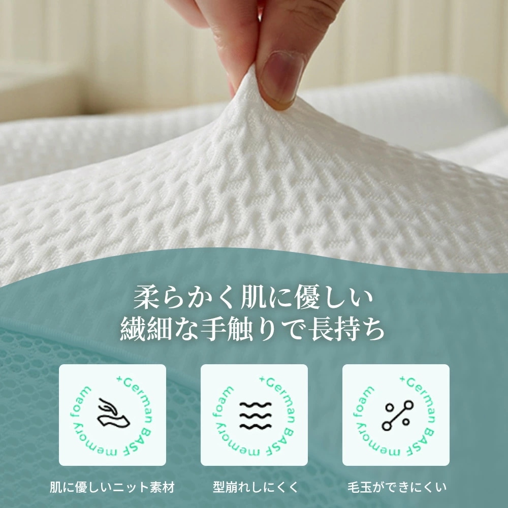 人間工学設計と圧力分散に優れた低反発により、体への負担を減少し、しっかりと頭、 首、肩をサポートしてくれます。首や頚椎を正常な形にキープして、呼吸がスムーズに出来るほか、 寝返りが軽減、いびきを軽減します。横向き・仰向け・うつ伏せ、どんな寝姿勢でもOK!
