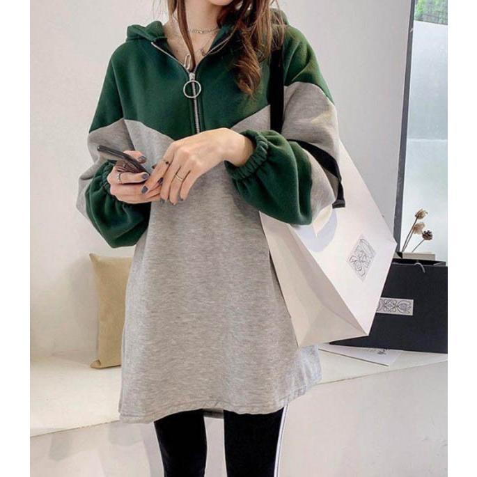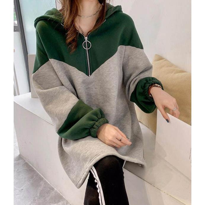 パーカー フード付き 切り替え オーバーサイズ プルオーバー ゆったり ファスナー付き ロング 配色 カジュアル レディース トップス パーカー