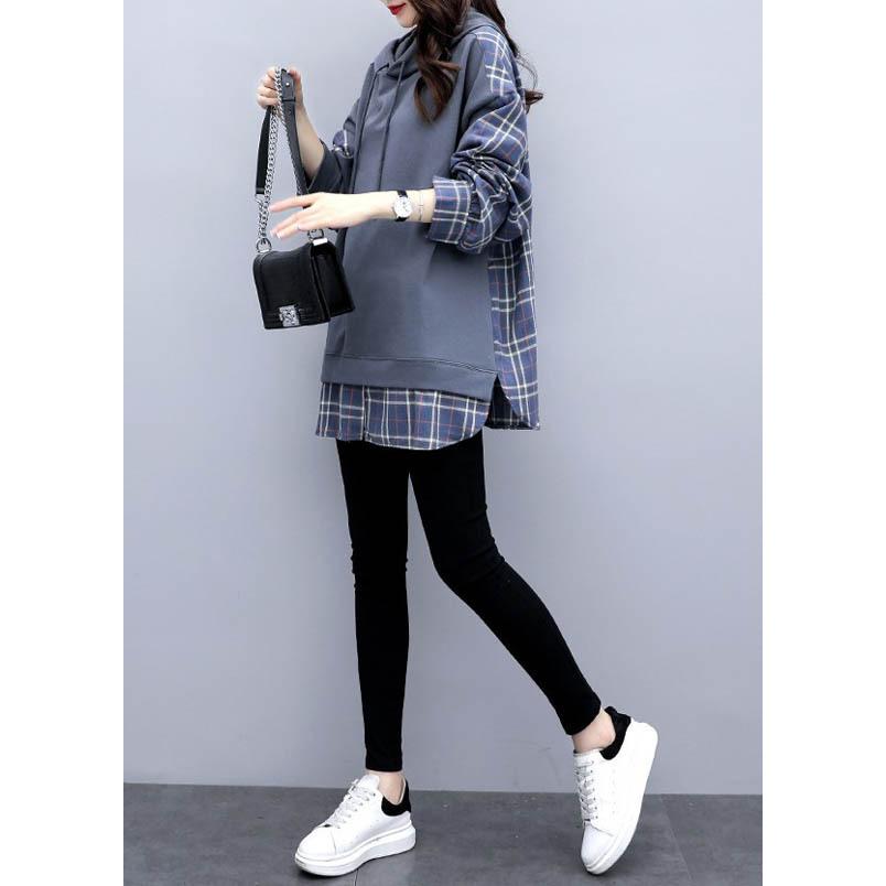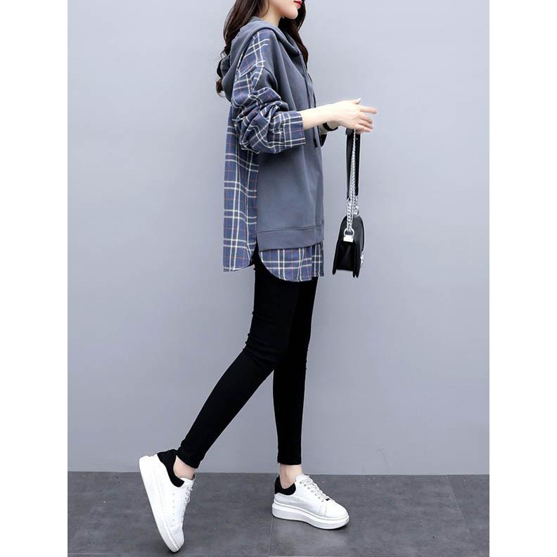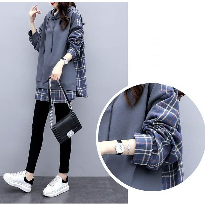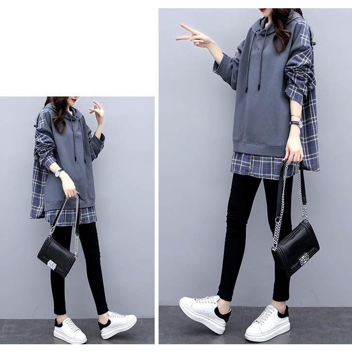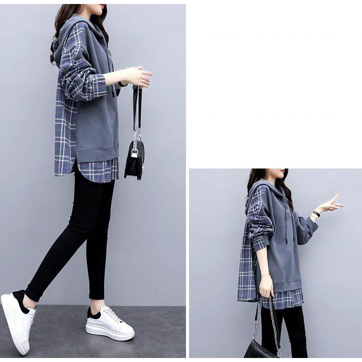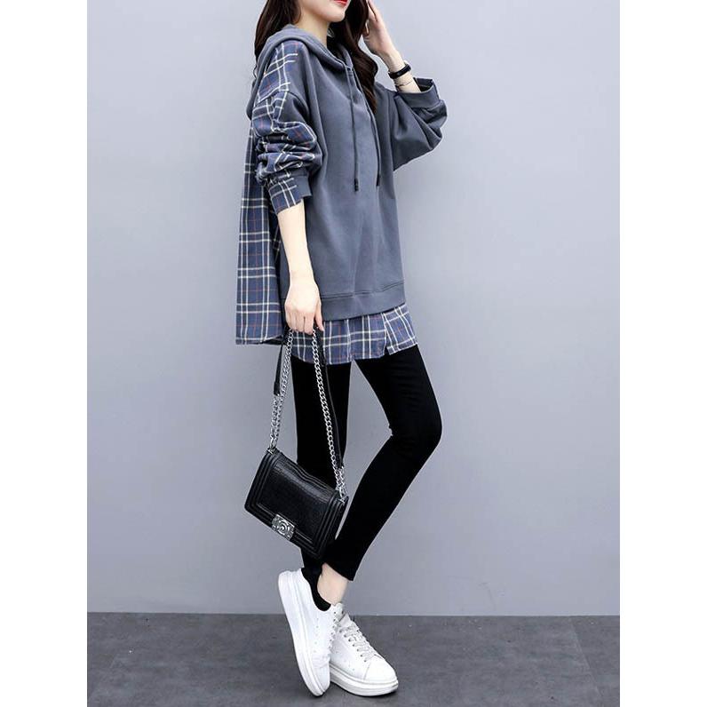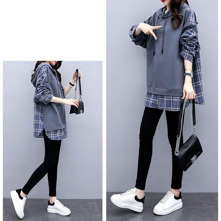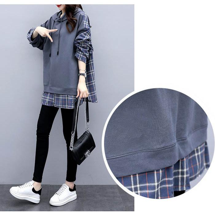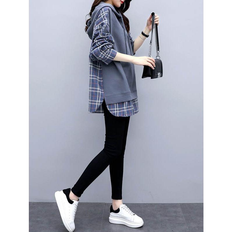 チェックシャツ 切り替え レイヤード風 フード付き レディース パーカー ドロップショルダー ゆったり トップス 大きいサイズ フリーサイズ 春秋 薄手