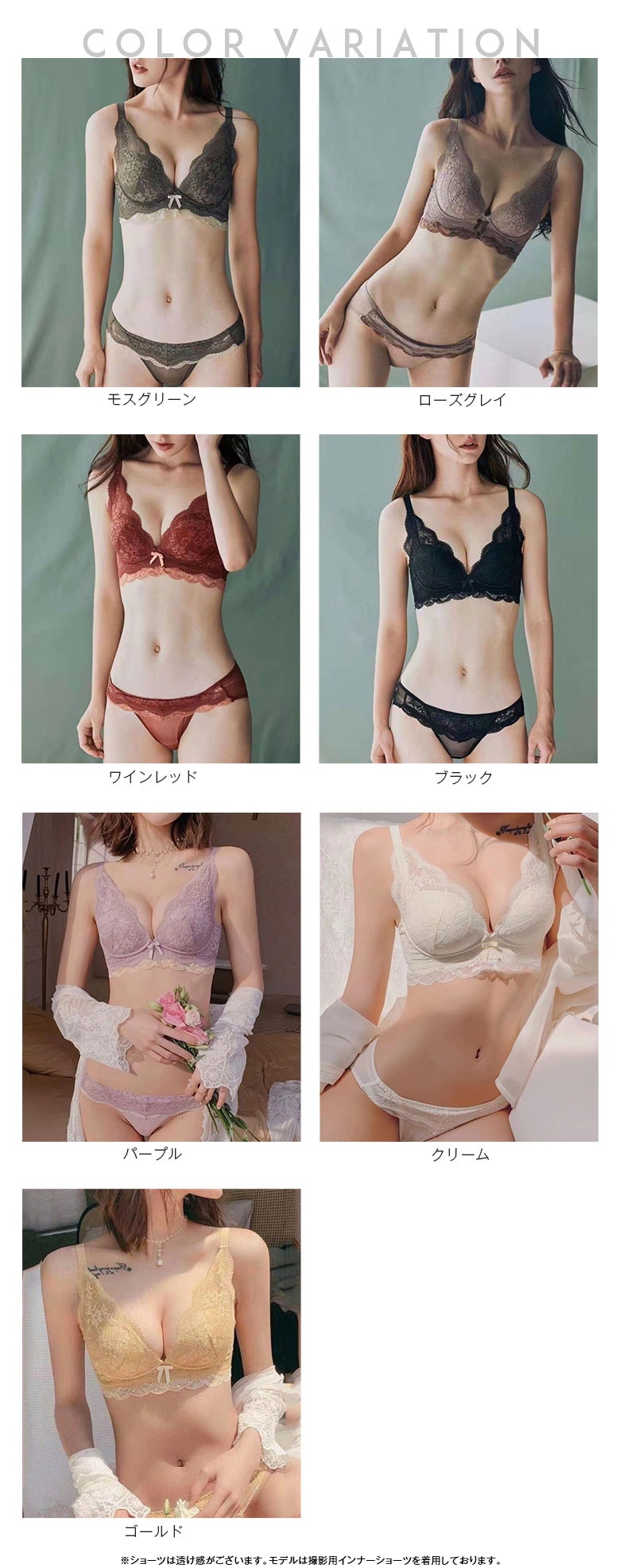 Color: モスグリーン(ブラのみ) ローズグレイ(ブラのみ) ワインレッド(ブラのみ) ブラック(ブラのみ) パープル(ブラのみ) クリーム(ブラのみ) ゴールド(ブラのみ) モスグリーン 透けないショーツ ローズグレイ 透けないショーツ ワインレッド 透けないショーツ ブラック 透けないショーツ パープル 透けないショーツ クリーム 透けないショーツ ゴールド 透けないショーツ