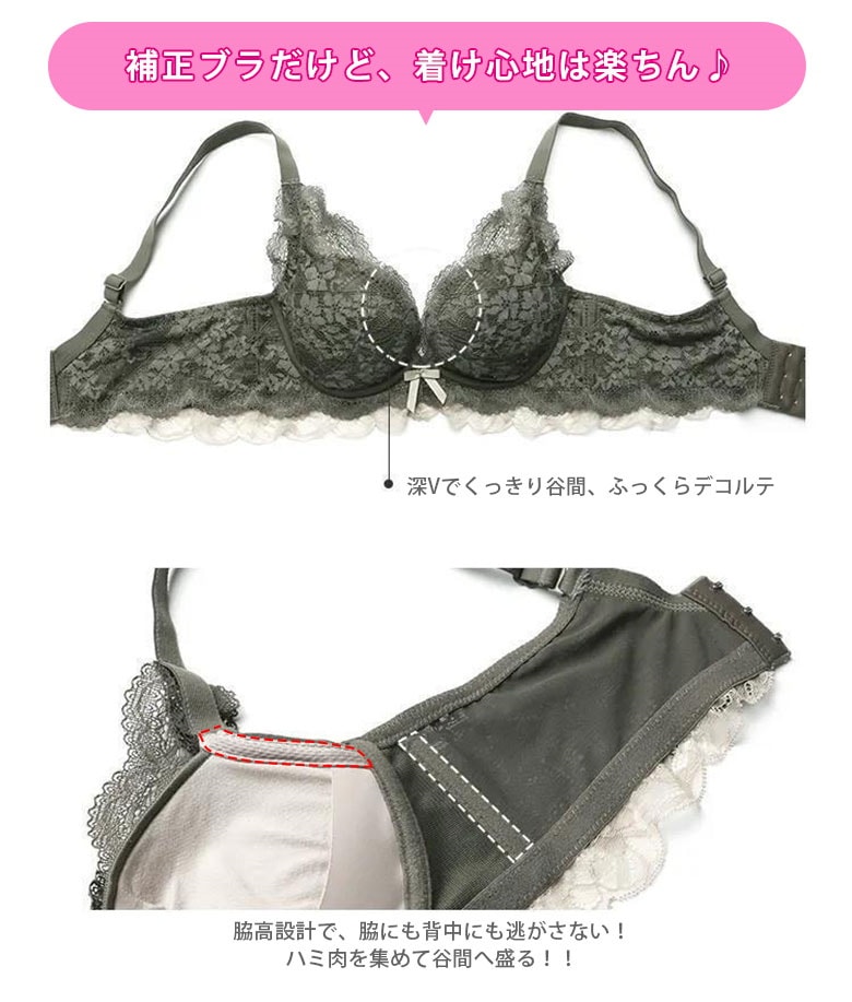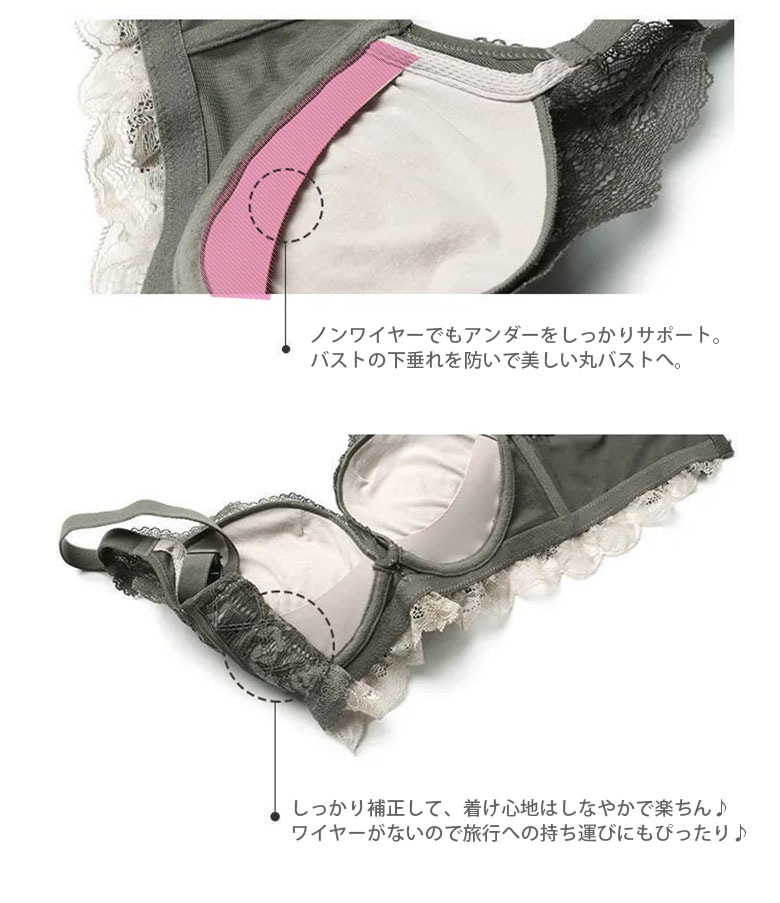 自胸で谷間復活 痛くなりにくい谷間メイク 透けないショーツ大きいサイズ追加 脇高でしっかり補正 谷間 ノンワイヤー ブラジャー セット レディース ブラ フリル レース 美盛 下着 上下