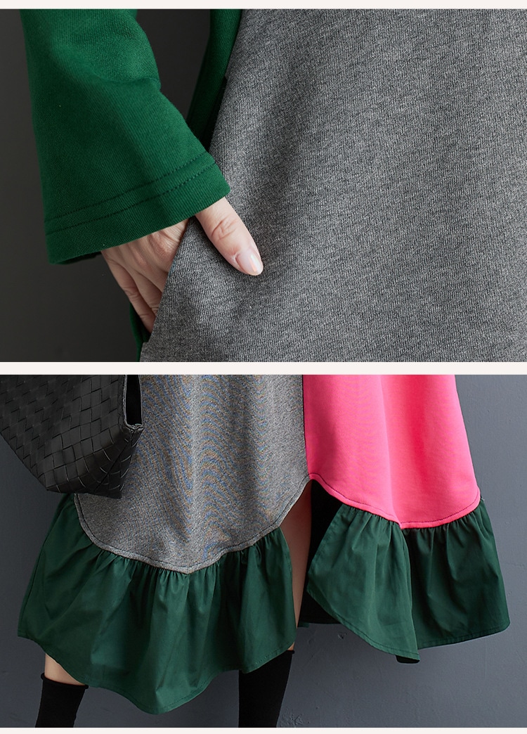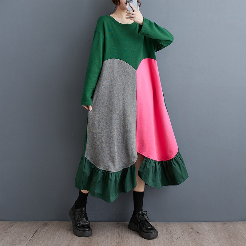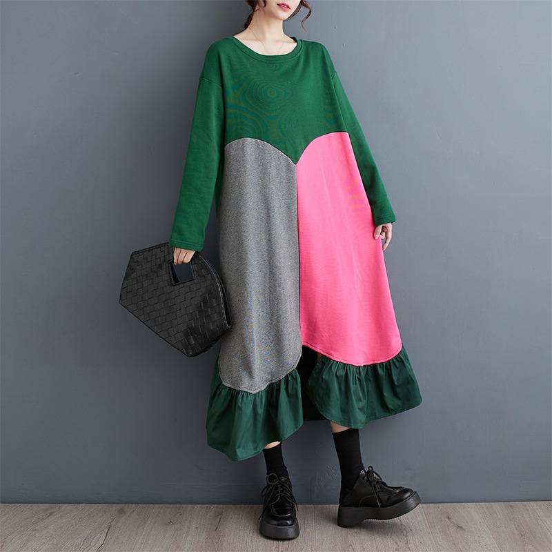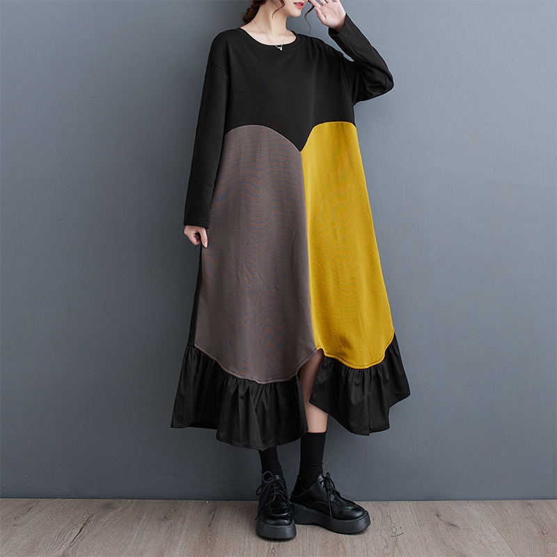 2色春秋の新金韓国版流行ファッション個性カジュアルアウトドア通勤復古文芸気質ゆったりサイズエレガント甘いアークジョイント減齢ジョイントロング丸首長袖ワンピースJGX56