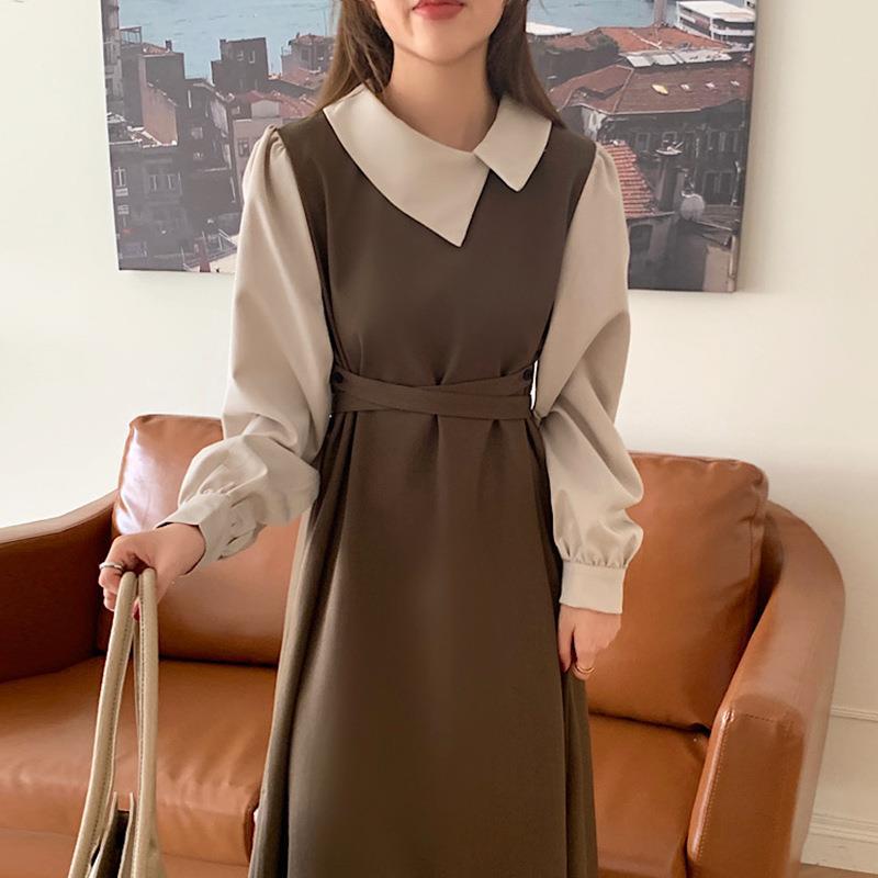 韓国chicフレンチレトロ 開襟 ドレス ワンピース 上品 通勤 OL レディース フレンチ ワンピース 体型カバー 長袖ロング マキシ丈ワンピ