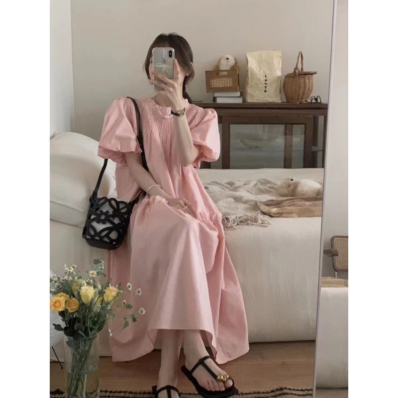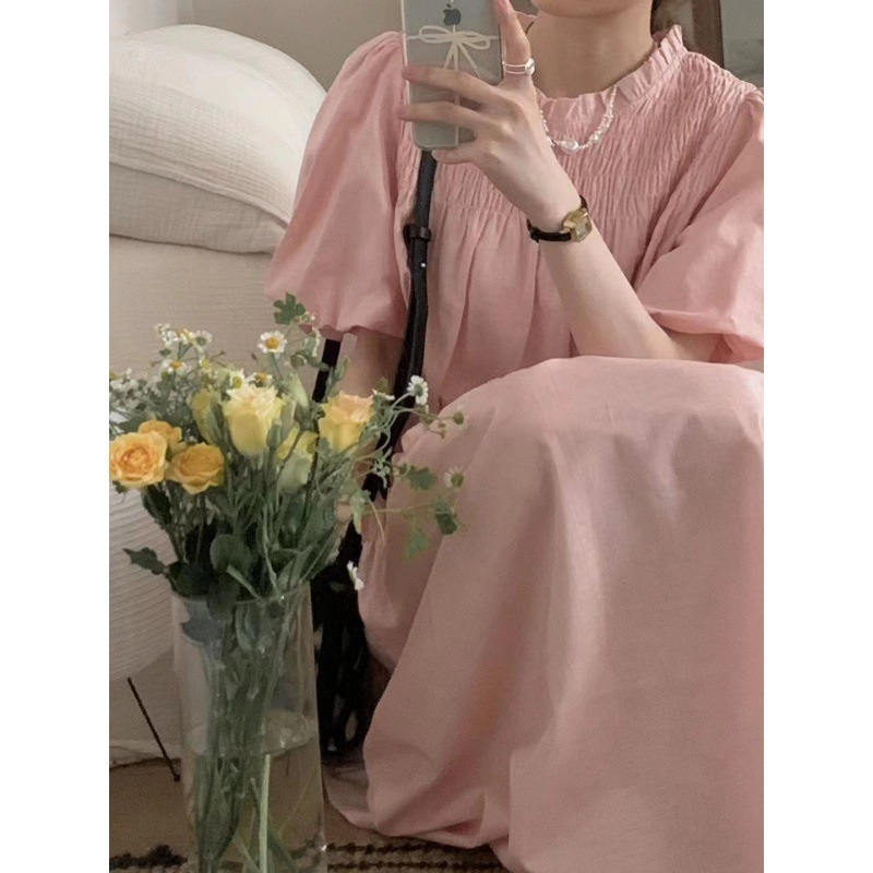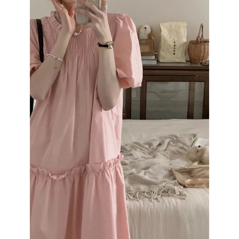 パフスリーブ ワンピース レディース 韓国 大人可愛い 夏ワンピ ピンク シンプル 半袖 おしゃれ かわいい リゾート 二次会 入学式 ワンピース きれいめ