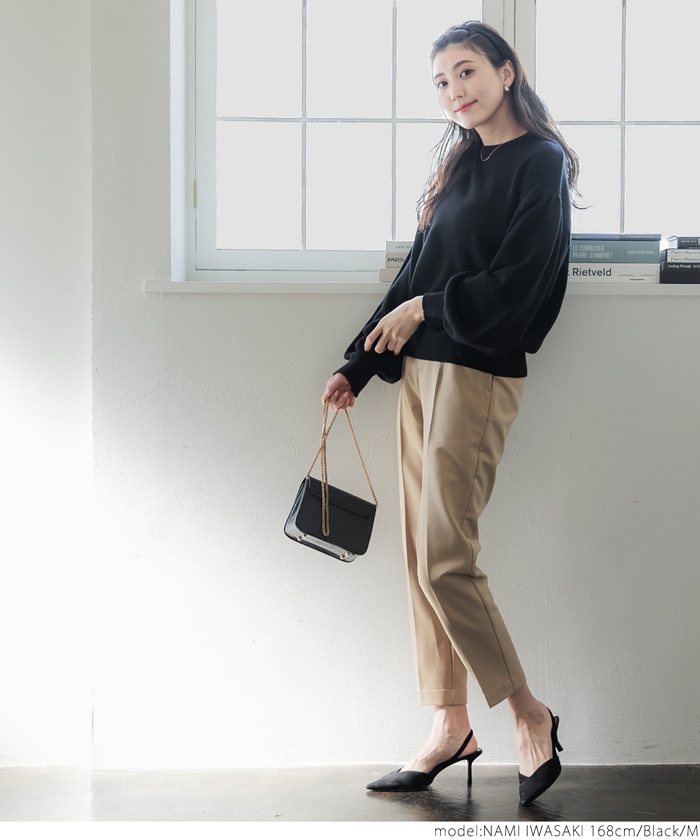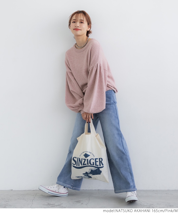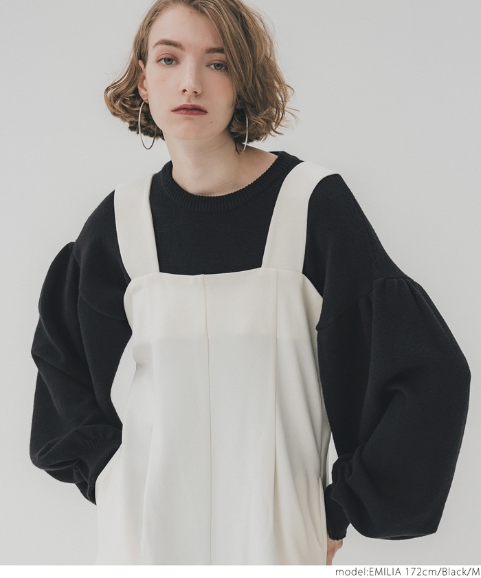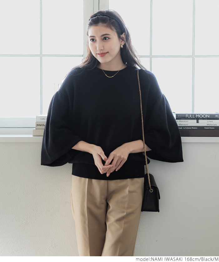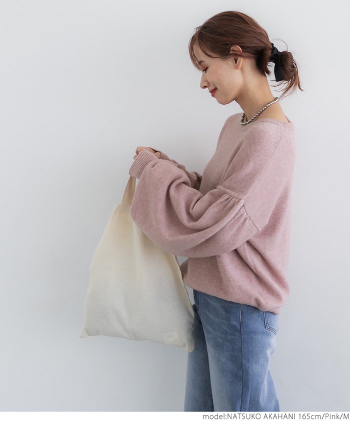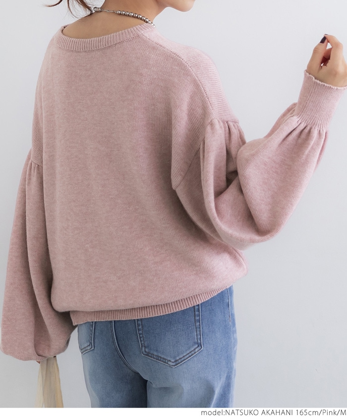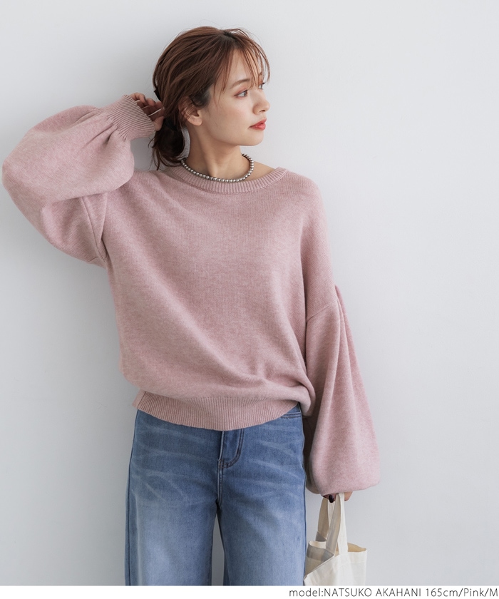 coca セール ニット レディース ボリュームスリーブ クルーネック ミディアム丈 長袖 無地 伸縮性 シンプル ニット