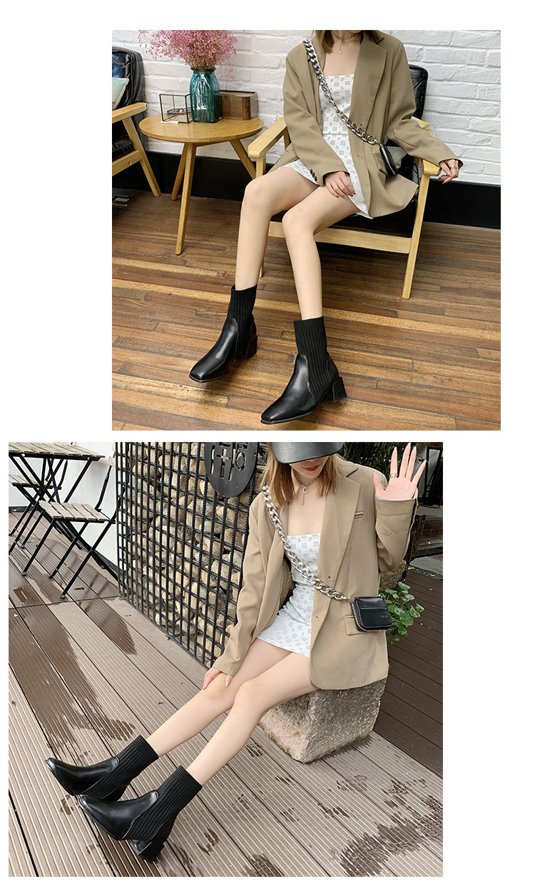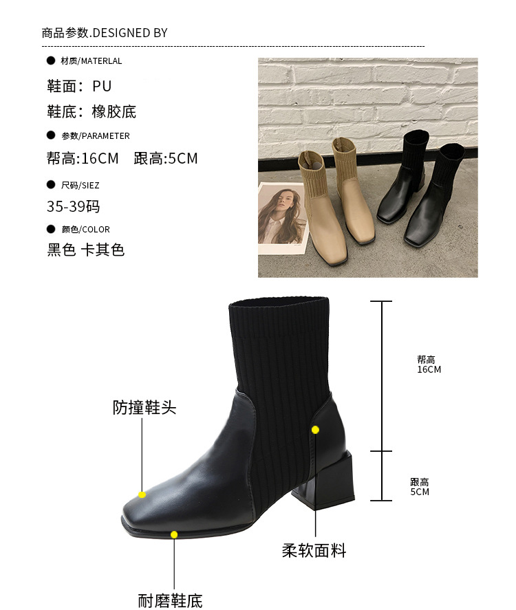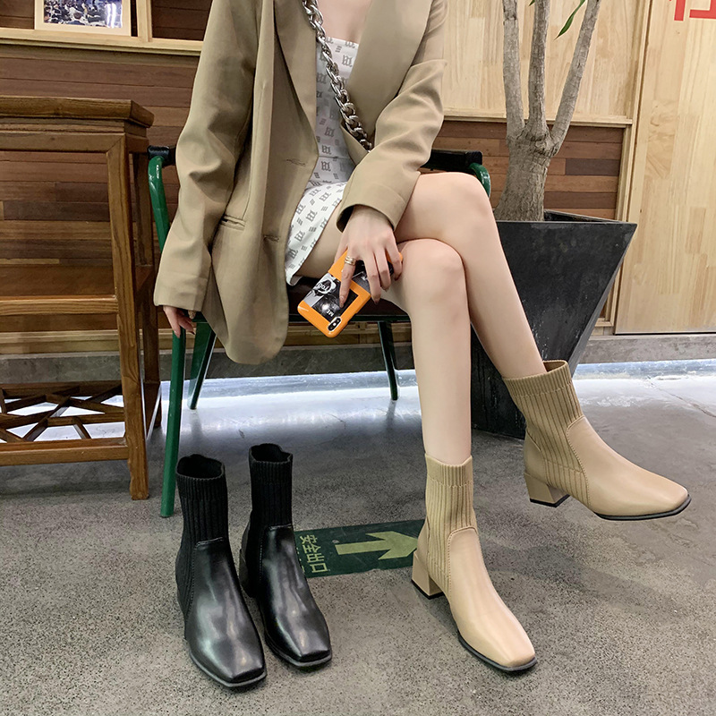 ブーティー 大きいサイズブーツ秋冬新作チャンキーヒールスクエアヘッドショートブーツ女性ニットアプリコットスキニーソックスブーツストレッチブーツ
