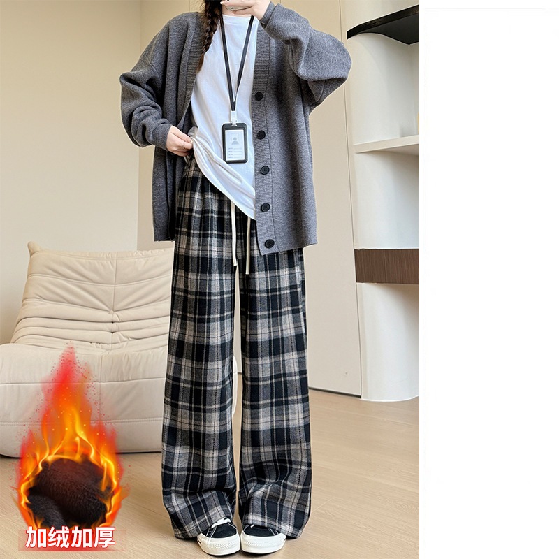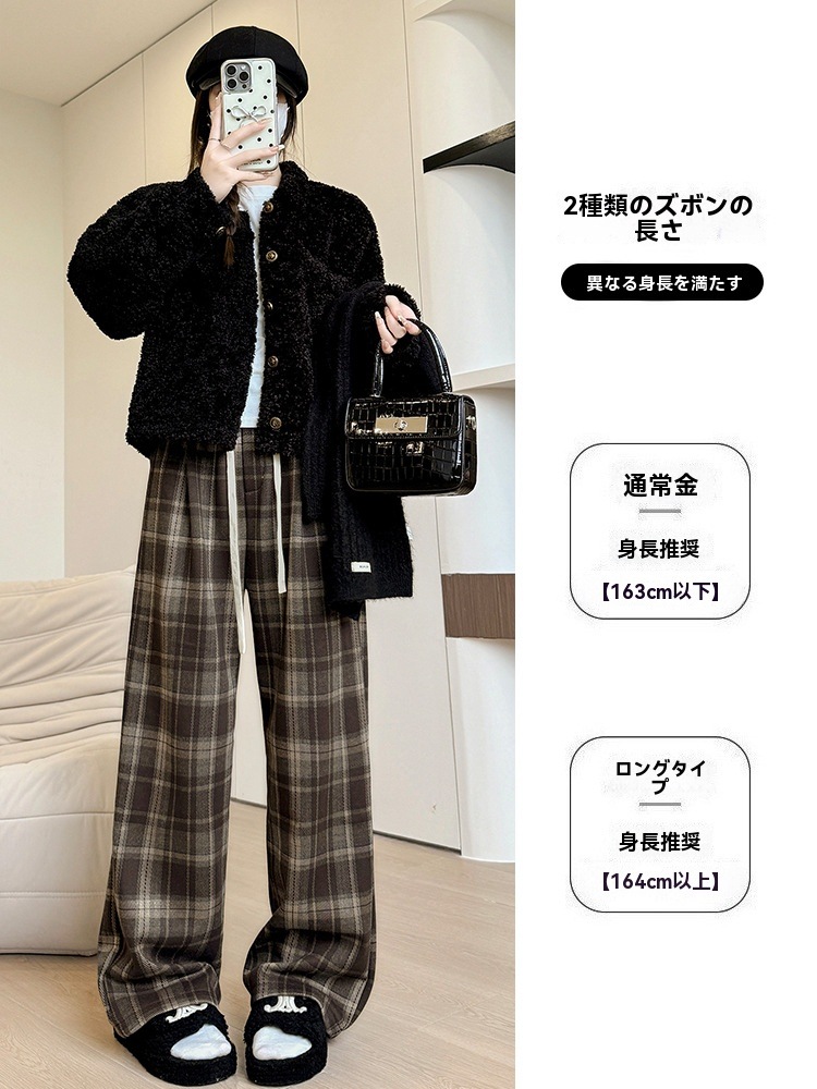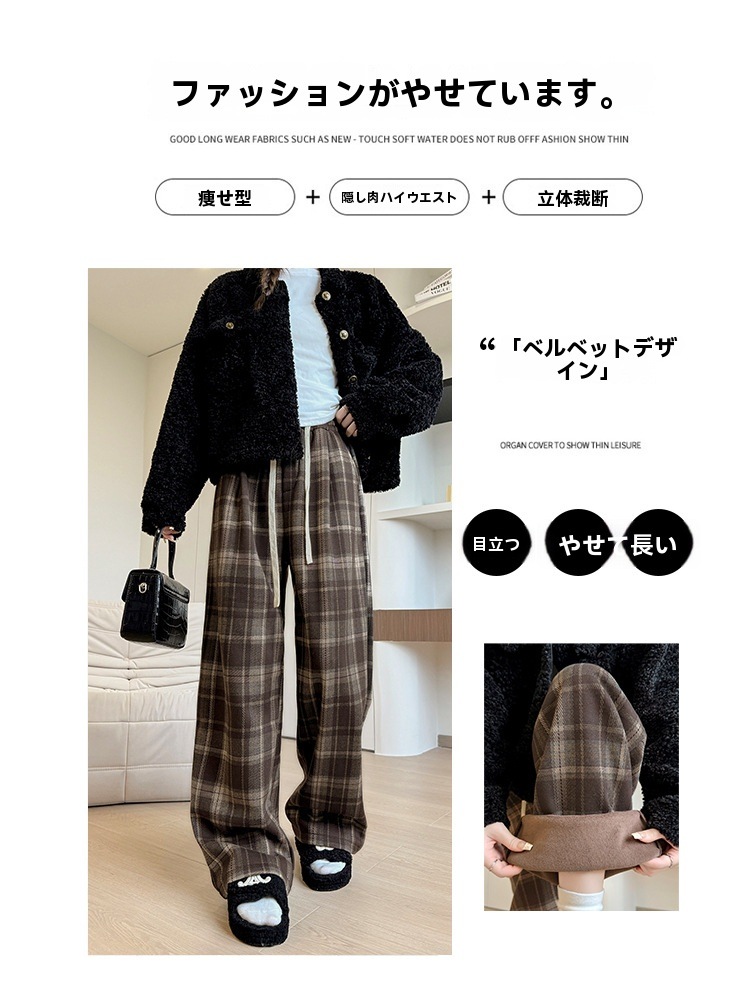 ストレートパンツ レディース ラシャ チェック ボア付き ハイウェスト パンツ 美脚 脚長 ストレート 体型カバー ボトムス ロング ボア 厚手 マキシ丈 ワイド ボト